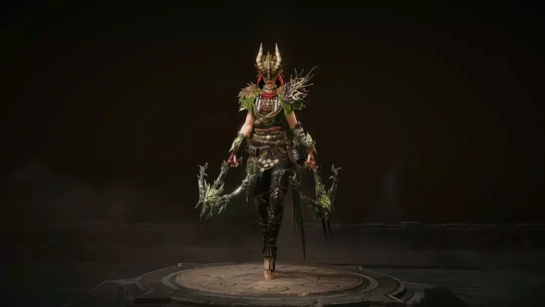 猎魔人身披树枝与皮革制成的轻甲,赤足联结大地,无声行于林间。手中双弩伺机待发,宛如毒蛇之牙,迎接侵犯家园的恶魔与腐化,每一次射击,都是自然的惩罚。