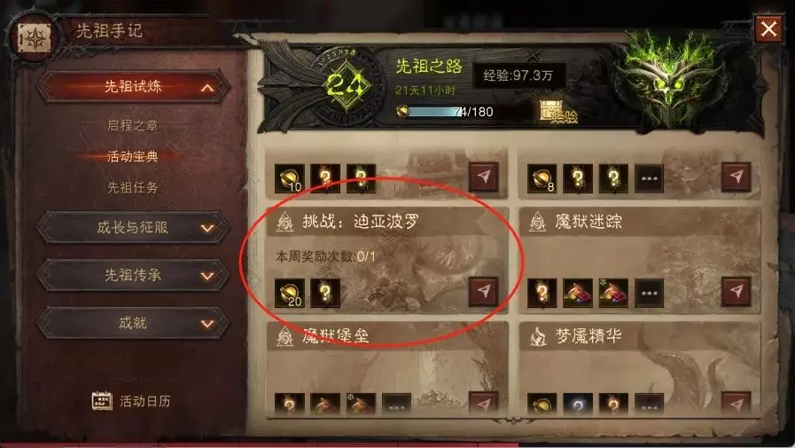 在公屏中的“大菠萝”,指先祖笔记中“挑战:迪亚波罗”任务的组队邀请,每周限一次挑战,会奖励装备经验。