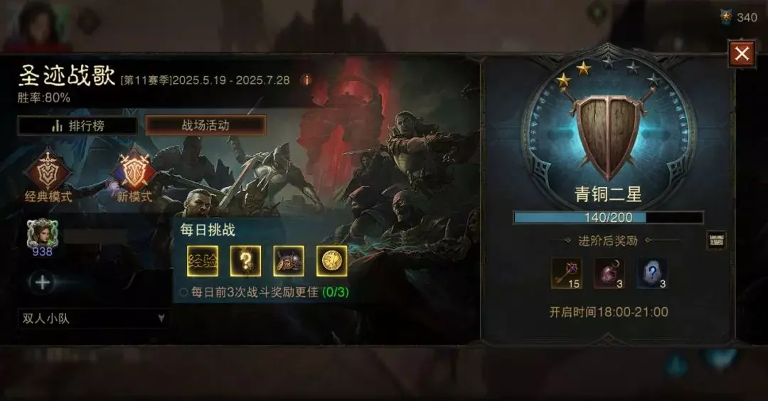 战歌的经典模式和统御沙场只能单人参与,而战歌的新模式可以双人组队。