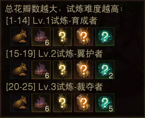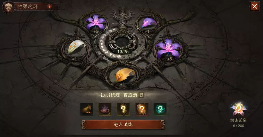 枯荣花的花瓣数目随机,总花瓣数越大,试炼难度越高。