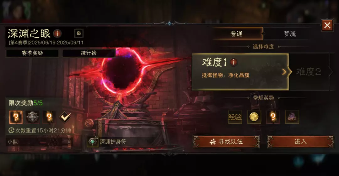 深渊之眼有专属的装备“深渊护身符”,可以在玩法内升级,提升自身实力。