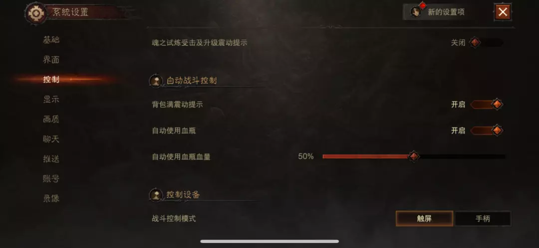 指在设置-控制-自动战斗控制中,设置自动使用血瓶血量的数值。