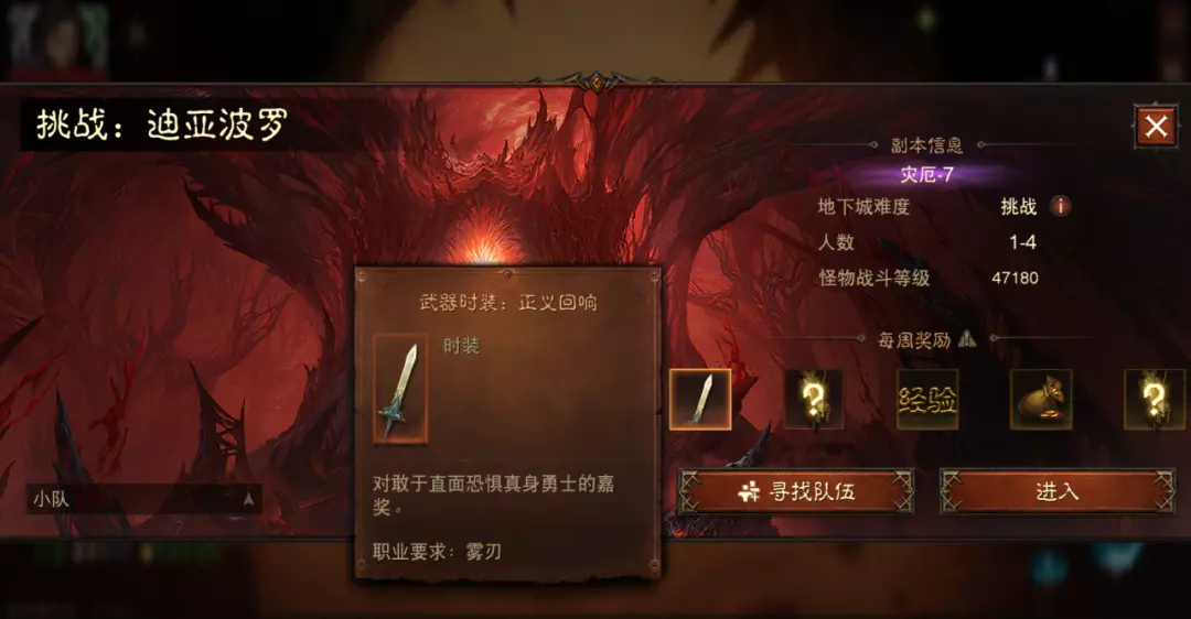 首次通关“挑战:迪亚波罗”,将获得武器幻化奖励,并且挑战有一定难度,因此在公屏上发现有人组队可速速参与!