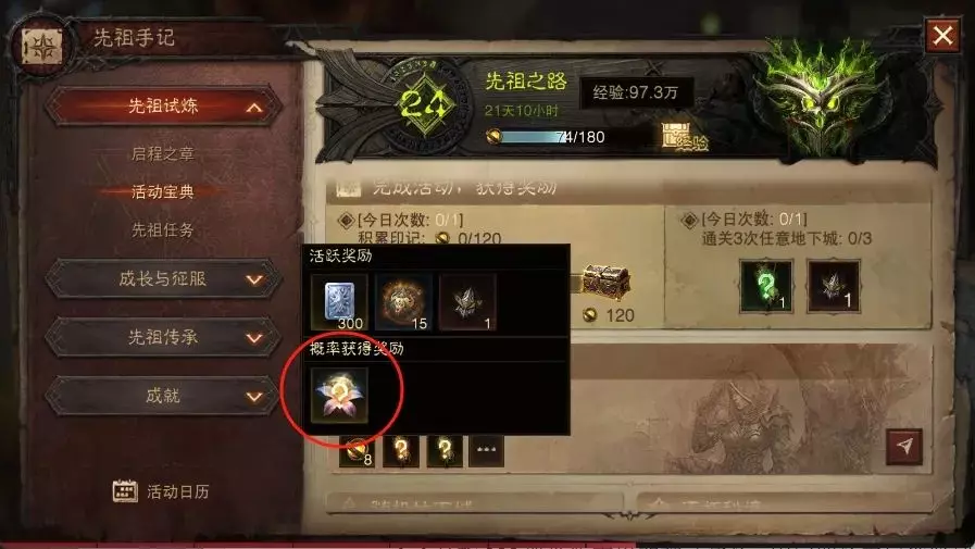 指枯荣花,在先祖手记-活动宝典中日常活跃奖励里有几率获得。