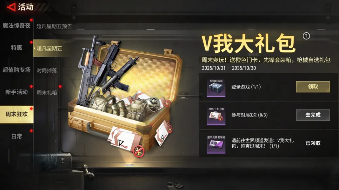 在世界频道发送:V我大礼包,超爽过周末!,即可获得【进阶先锋套装箱】