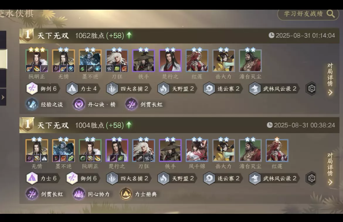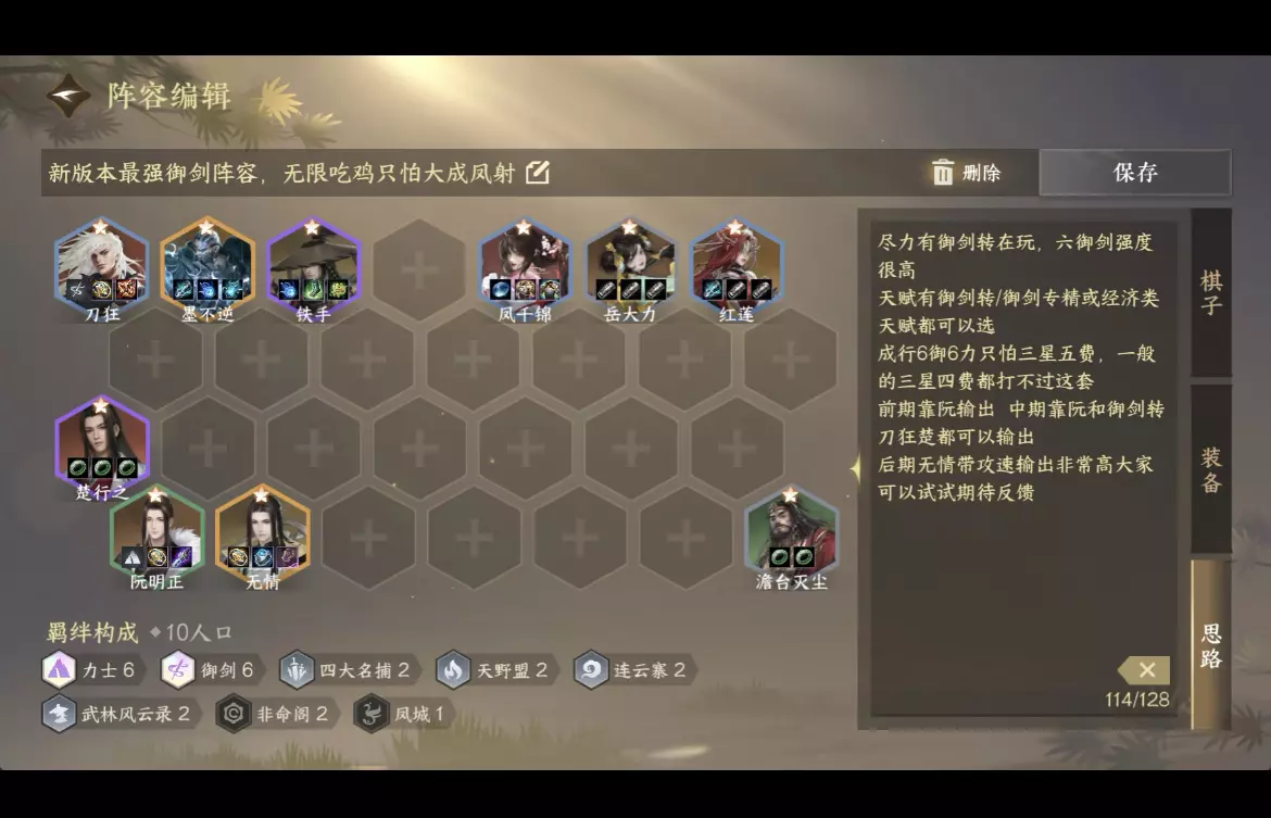 纯公式阵容 不太吃运气 保底前四稳定吃分 ⭐装备选择: T0:驭风镯 噬邪锏 连星弓(先兵后礼) T1:喋血刃 叠浪锋 傲血铠 万重弓 两仪佩 连星弓 其他:随便带吧区别都不大 御剑吃攻速和攻击吸血 [自拍R]防御装建议捡垃圾即可,优先后排装备 保证有一件卸甲装备即可 ⭐独珍建议: T0:摘星手 T1:丹心/唐铸/扇子/裙子/源清钢/隐贤鞋子/六尊使 输出类独珍对御剑的提升都比较大 可以看情况选择 防御独珍建议: 张叔夜/种师道: 力御多前排 如果有高星老黑和凤千锦会比较好用 其他时候一般 墨不逆:只有老黑、凤千锦和黑天有用 看自己棋子等级抓 姜却:效果不错 御剑后排比较脆 如果有射手类对手建议拿,开局护盾+免控很不错 铁手帽子:效果一般 御剑只有无情和楚需要大量蓝打输出 选出来就是纯防御装 无情格子太少 如果有攻速镯+帽子+令牌还不错 其他时候不建议选 如果前排血量太低也可以拿了补前排输出 [害羞R]一般情况下同等级装备优先抓独珍 就算不厉害可以赌一次重铸 ⭐心悟选择: 1.优先保证有御剑转,六御剑强度高 2.力转御剑专精也可以抓 速开六力士 理想情况十级开六力六御剑成型 3.御剑比较吃等级,建议看到晋升类的经济经验天赋也可以直接选 4.如果没有好的天赋可以选吸血/攻击/两仪这种属性类天赋 5.御剑不要选龙卷风/技能增伤/开局加蓝类的天赋 注意:如果有不知道强度的天赋可以留言 ⭐运营思路: 1.开局抢阮2哥,然后给所有御剑和力士标推荐 2.前期可以开2力2御 过渡 力士和御剑同时在优先开高等级御剑 3.运气好的人可以先挂2力2御+3宠物过渡 ,8级开四宠物找御剑转 4.常规情况不建议挂多宠物,尽力保血量保分 选秀有御剑/力转优先拿,其他垃圾转职也可以抓,用装备重塑赌御剑力转都可以 5.一般七级可以四御四力,8可以试试运气看有没有无情 6.9级一般可以开六御四力,看厂上情况,如果经济好就上十,如果经济差就d三星楚行之或2星无情 7.御剑比较怕刺客 但现在刺客非常少见 大成凤射必须有六御和力转 ⭐占位建议: 御转刀狂和阮哥放在同一侧,刀狂旁放带卸甲的力士,前期放大力中期铁手后期老黑,帮助打控制给卸甲 让阮和刀狂可以快速清场 #逆水寒周年庆 #逆水寒手游 #逆水侠棋 #逆水寒权威版 #逆水寒次元破壁 #御剑 #逆水寒 #勇闯游戏岛 #游戏心动存档计划#2025开学季