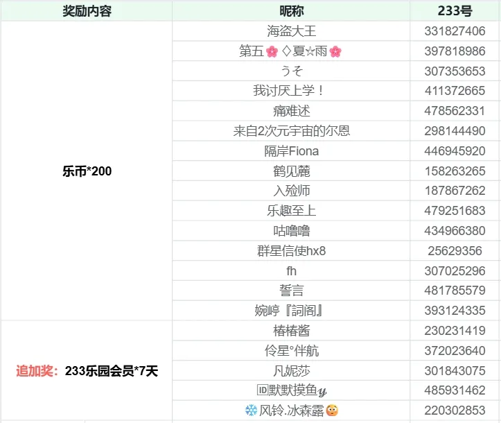 🏆抽取7名玩家获得乐币*300,233乐园会员*7天