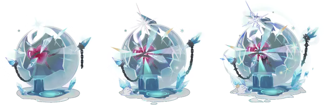 背景设计上,似坚冰又似镜子的透明囚笼,两侧冰棱成簇绽放,锁链之中,一颗被侵蚀束缚的心绽放着微弱光芒,与上方明亮闪耀的北极星呼吸与共。那是凯伊过往的悲喜聚散,它高悬空中,注视着、期待着、等待着,那藏在不化坚冰中的爱与温暖,春回大地的时刻。
