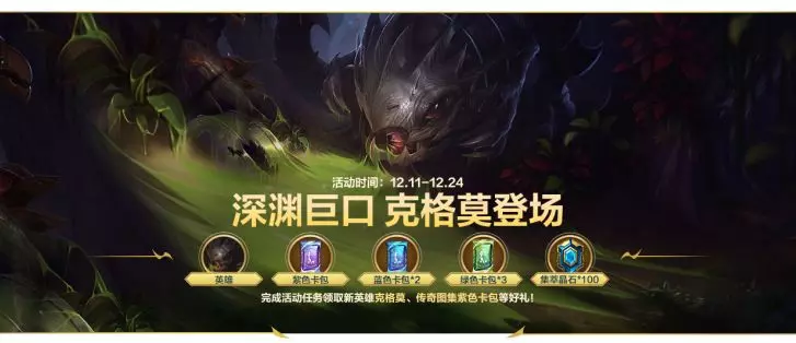 12月11日00:00至12月24日23:59活动期间,召唤师完成活动任务即可领取新英雄 克格莫,传奇图集紫色卡包等好礼~