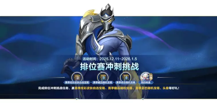 12月11日00:00至2026年1月5日23:59活动期间,召唤师完成排位赛挑战冲刺任务,即可获得赛季炫彩皮肤自选宝箱、赛季藏品随机宝箱、赛季姿态随机宝箱、头像-雪的味道等好礼!