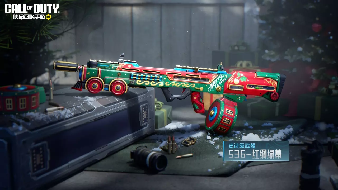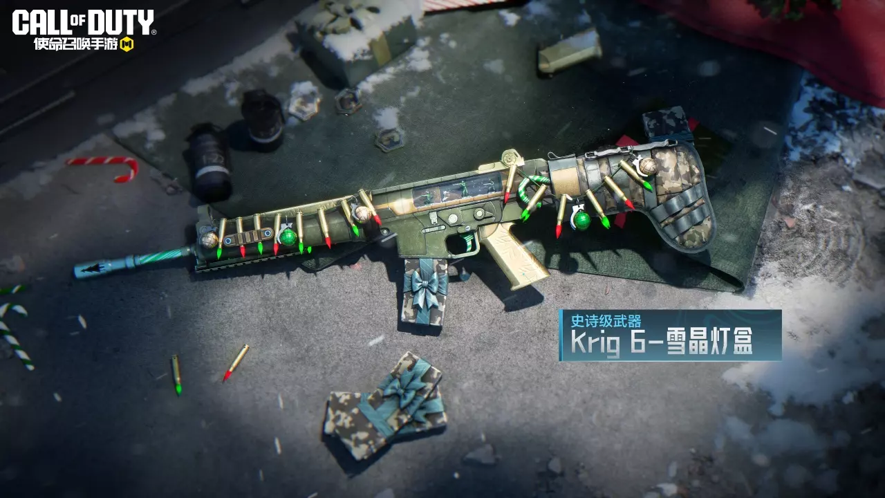 Krig 6-雪晶灯盒将子弹设计成圣诞彩灯的模样,装点枪身。弹匣采用迷彩图案,又制作成节日礼物的模样,既有节日氛围又具有战斗气息。