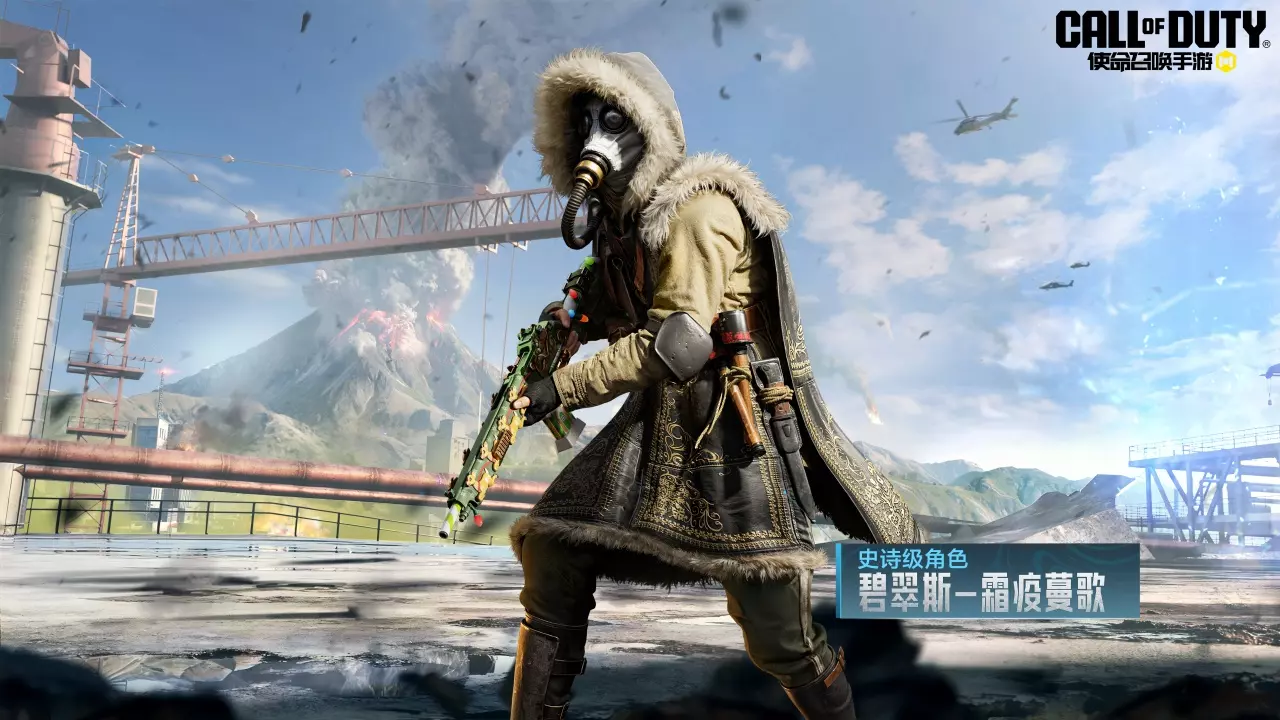 碧翠斯-霜疫蔓歌头戴防毒面具,身穿毛领棉服和长靴,貌似已经适应极地作战环境,其整体造型融合了冬季元素,给人神秘独特的感觉。