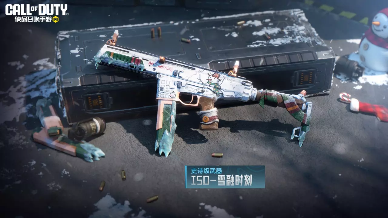 ISO-雪融时刻主体为白色,枪身被寒冰覆盖。枪体印有雪人图案,枪托缠绕着冬季的围巾,但这一切都不能抵挡武器散发出来的寒意。