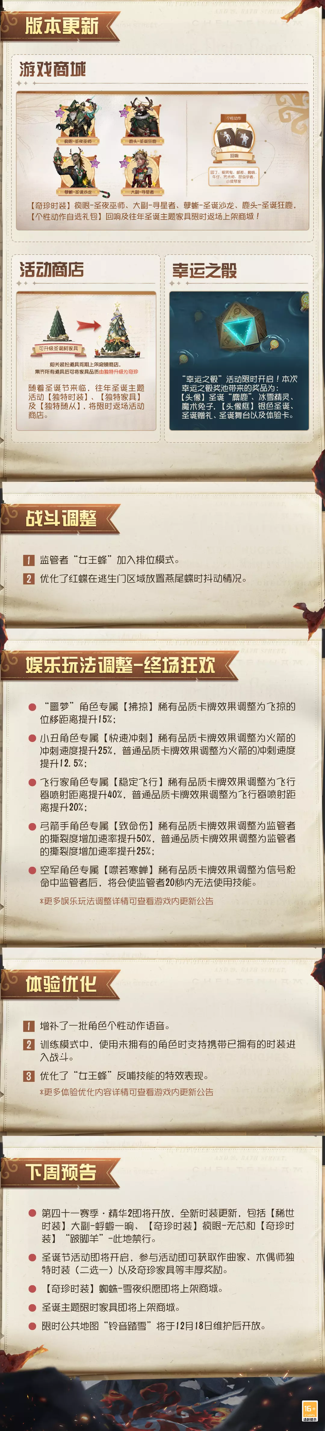 本周将采用不停服维护方式。7点30分服务器进入不停服维护状态,届时各位访客依旧可以体验大部分玩法和功能,包括但不限于:匹配、自定义、活动、推理之径等,商城的物品可以正常购买;