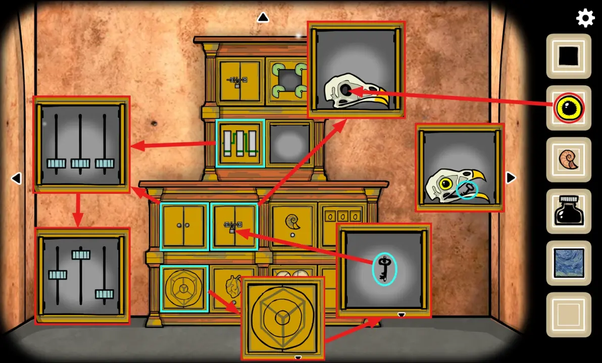 用刚得到的(钥匙)打开右上角的柜子,里面放着一个鸟头,将(鸟的眼睛)放入眼眶中后点击鸟嘴,获得(钥匙)