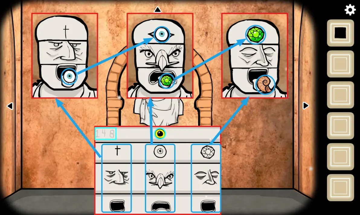 第二个雕像拼完后将(眼睛)装到额头上,点击嘴巴获得(宝石)