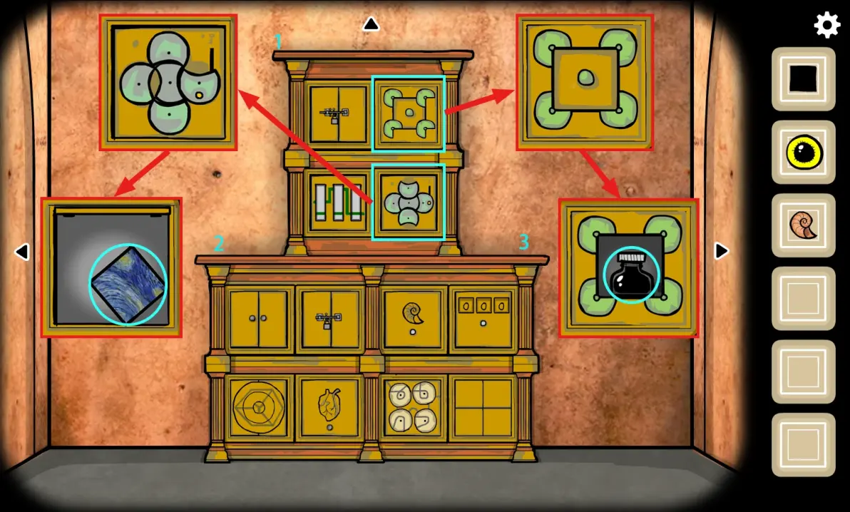 点击2号区域,打开左上角双开柜门,根据1号区域左下角柜子的提示,将三个开关如图设置(1号位按一下,2号位按两下,三号位不变);