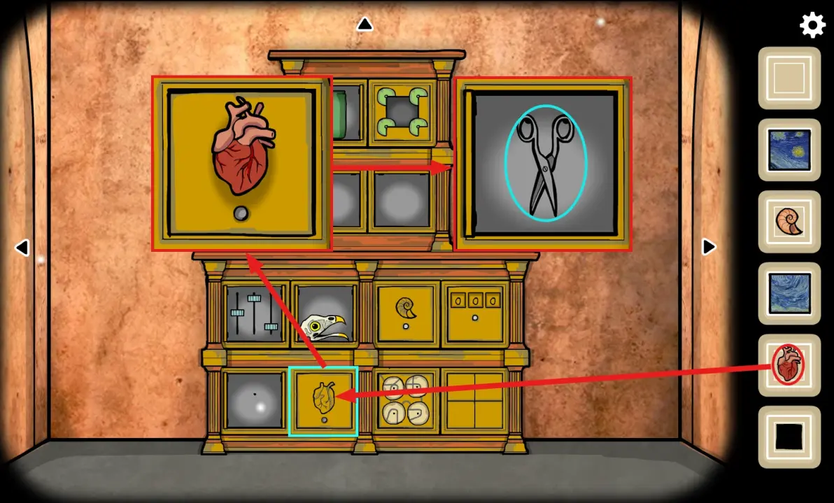 点击2号区域,将(心脏)放到右下角的柜子上,打开柜子获得(剪刀)。