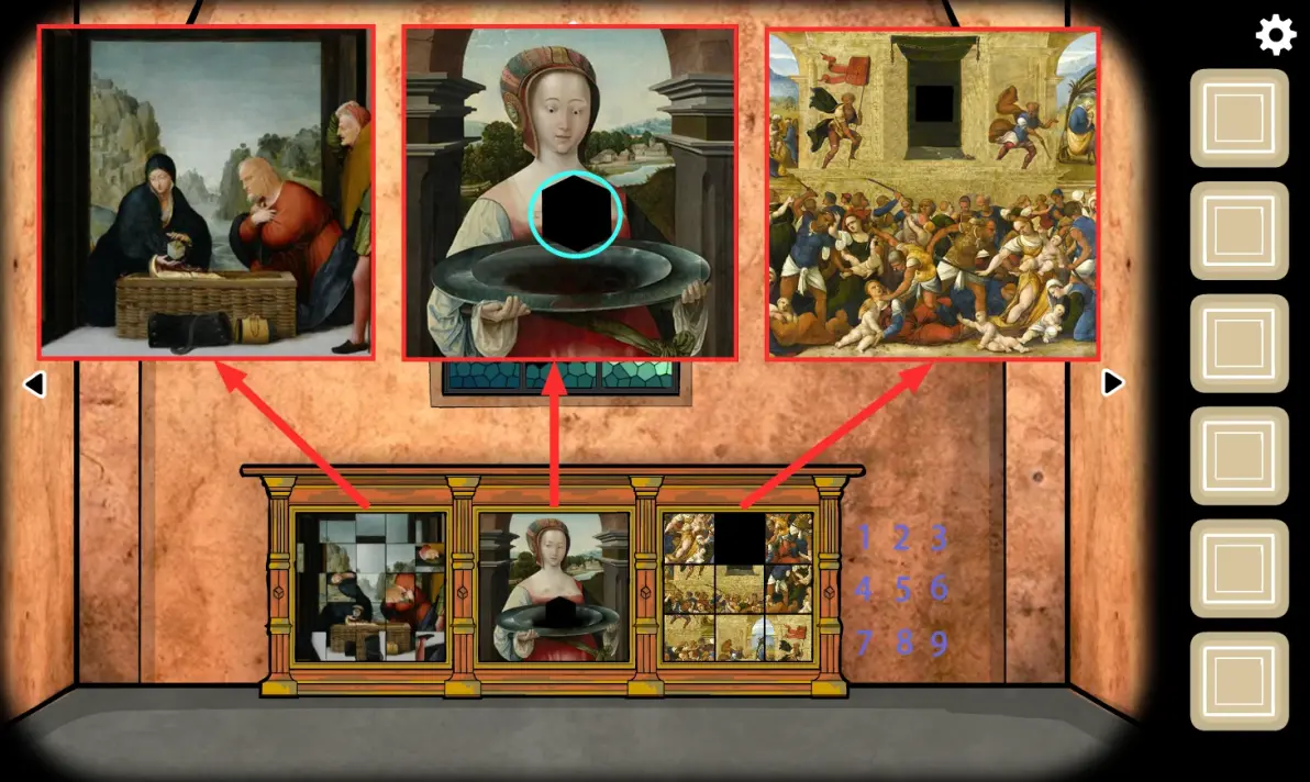 点击右边的画,移动拼图使画变完整,按照九宫格的数字移动对应的拼图,具体的顺序为“3、6、5、4、7、8、9、6、5、4、7、8、5、2、1、4、7、8、5、2、1、4、7、8、9、6、5、4、7、8、5、4、7、8、9、6、5、4、7、8、5、2”,完成后的画如图(如果失误直接把上一块点回来或者退出界面重进刷新即可);
