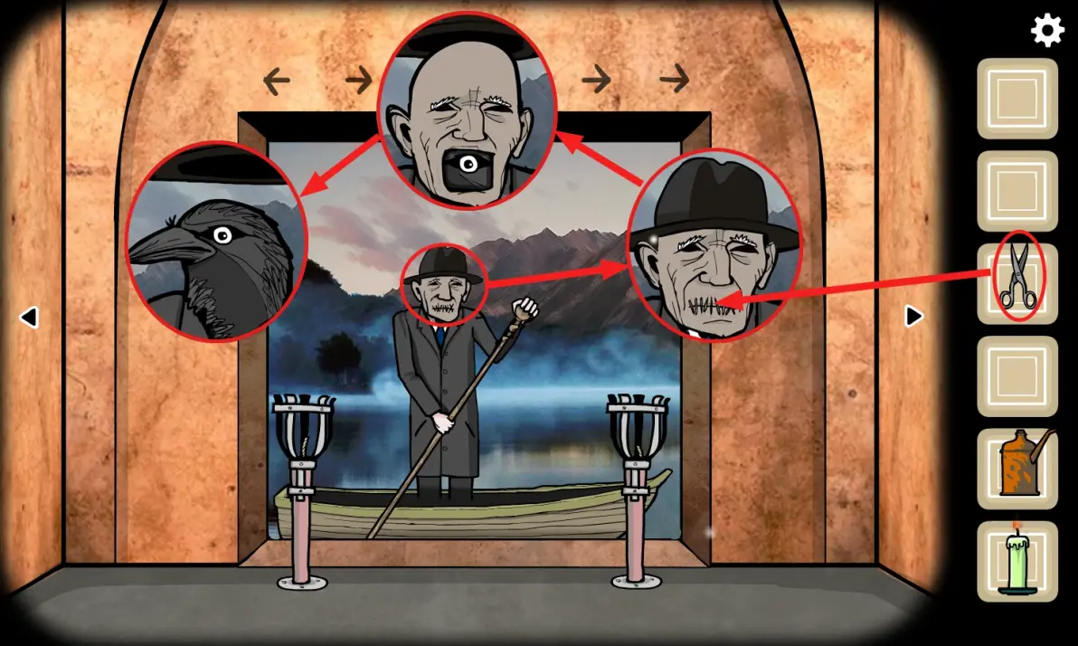 点击乌鸦先生,用(剪刀)将缝住嘴的线剪掉,从乌鸦先生的嘴里冒出一颗乌鸦脑袋,乌鸦先生变成了阿修罗形态,点击小船,第三个案件结束。