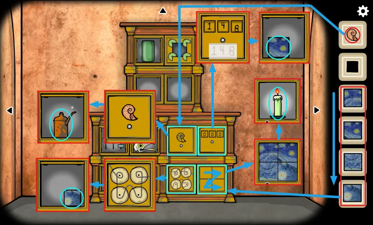 按照物品栏中从上到下的顺序将(碎片)按Z字形放到右下角的柜子上,打开后获得(蜡烛)。