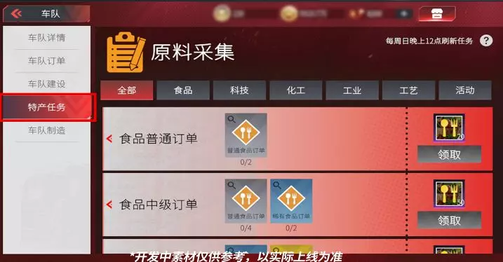 完成指定订单即可获取各类制造原料,任务订单将于每周日晚24:00自动刷新。