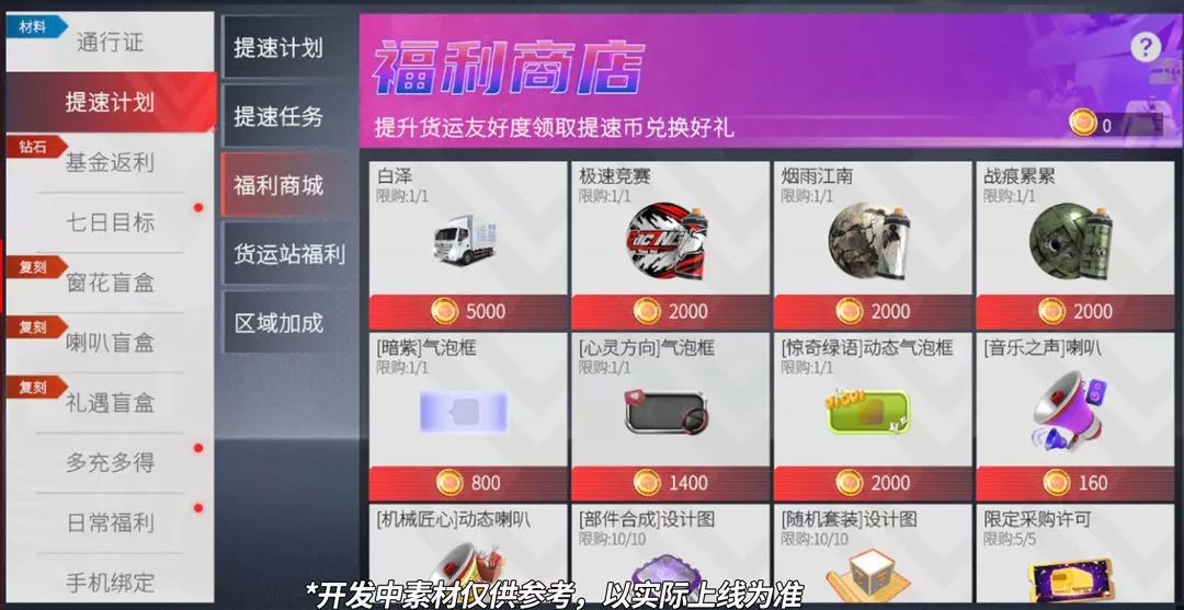 ③福利商城:可使用从「货运站友好度提速奖励」中获得的「货运里程币」,在此兑换各类奖励道具。