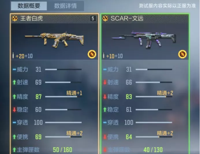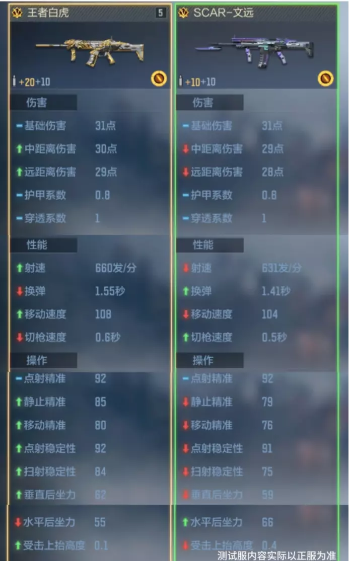 伤害表现上,二者基础伤害同为 31 点,但王者白虎中距离伤害 30 点、远距离伤害 29 点,分别比 SCAR - 文远高出 1 点,距修的优化使得王者白虎可以在中远距离对枪时能打出更高伤害,压制力更强。