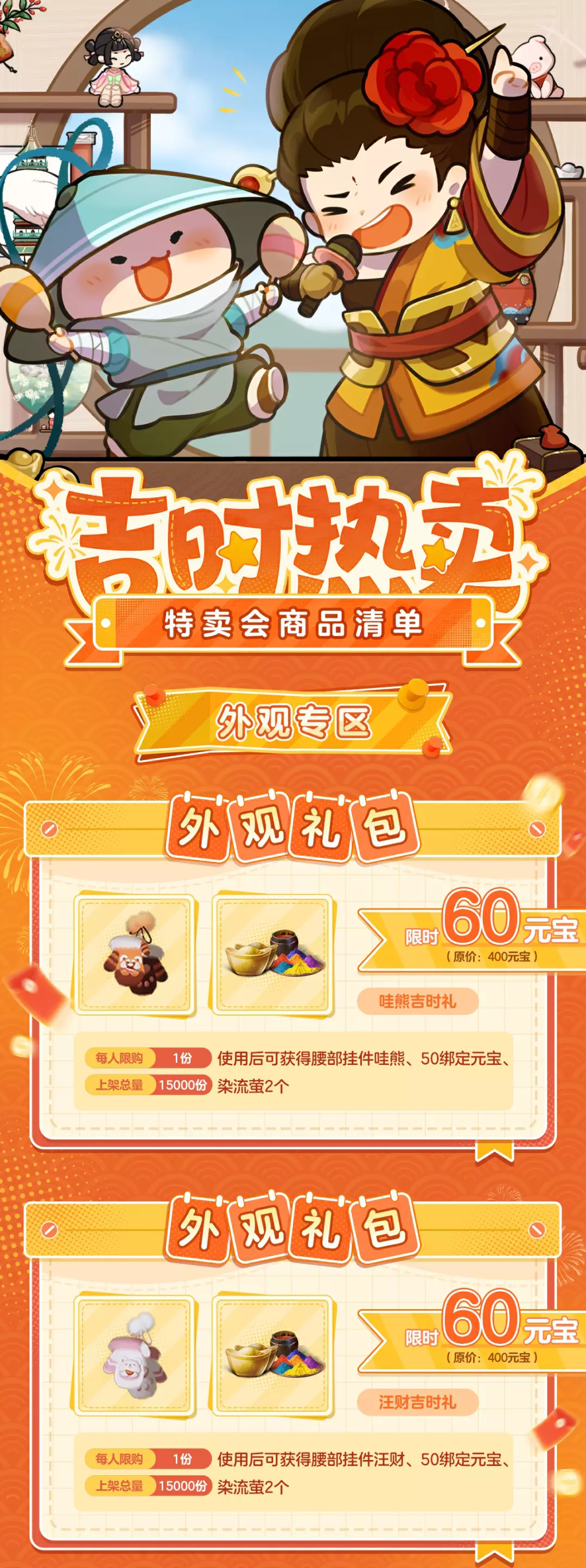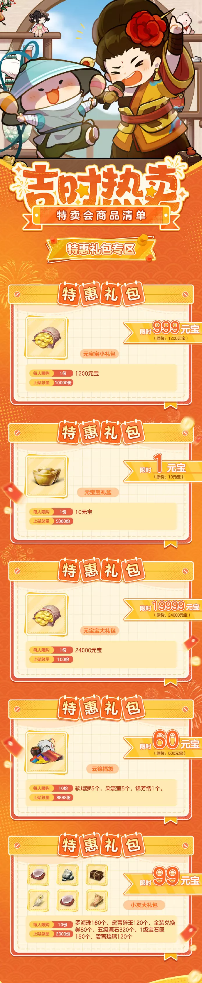 注:午间、晚间两场热卖将合并计算元宝返利额度及尊享礼包消费额度,购买尊享礼包的花费不会计入元宝返利进度中。