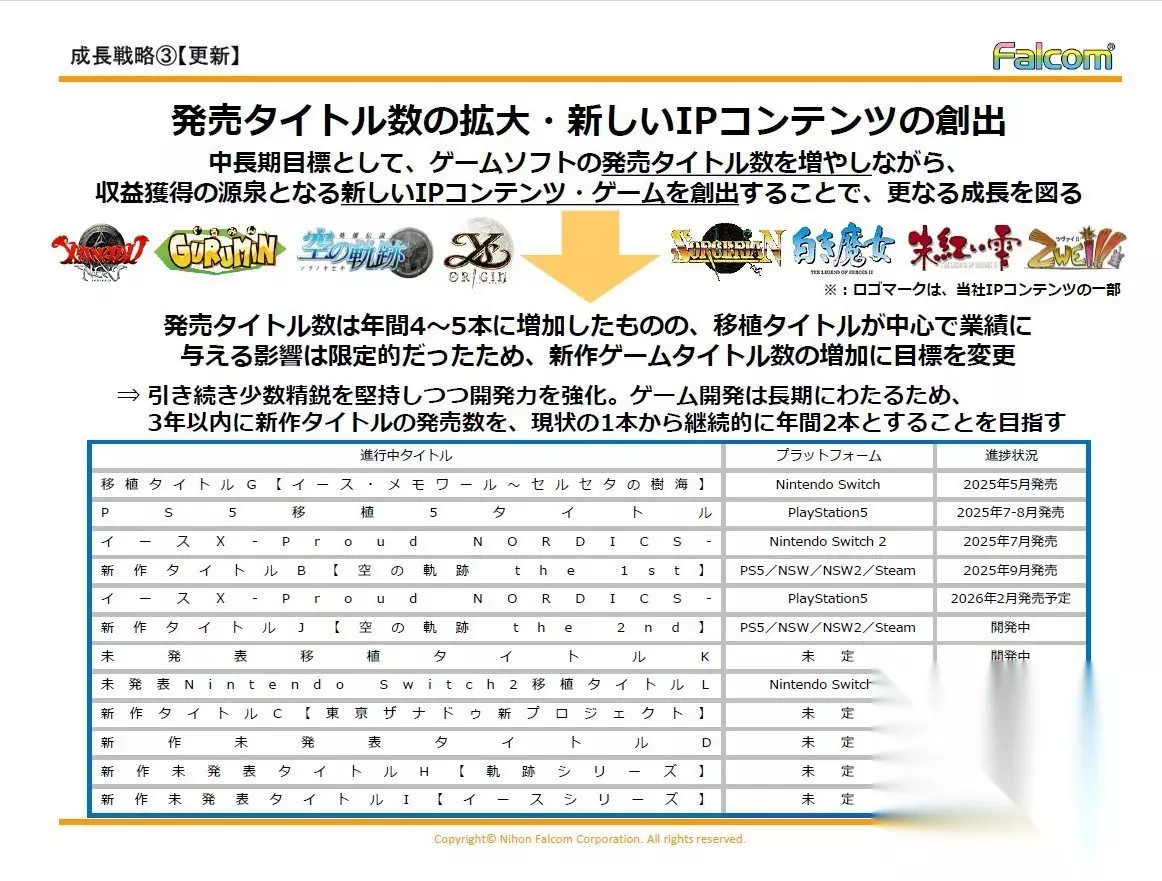 法老控发布了未来的游戏发售表,其中显示还有多款未公布的新作在开发,包括:未发表 移植作品 K未发表 Nintendo Switch 2 移植作品 L新作作品 C 【东京迷城新企划】新作 未发表作品 D新作 未发表作品 H 【轨迹系列】新作 未发表作品 I 【伊苏系列】