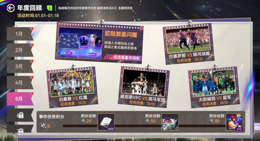 完成每月对应的年度事件任务赢取诸多【83+】主题球员包。2025这一年,发生了无数热血故事,是时候重新回望与见证。跟随活动历程,再次走过那些影响深远的重要瞬间。参与活动赢取好礼,各位主帅在回顾荣誉同时,还可以为球队继续积蓄力量!