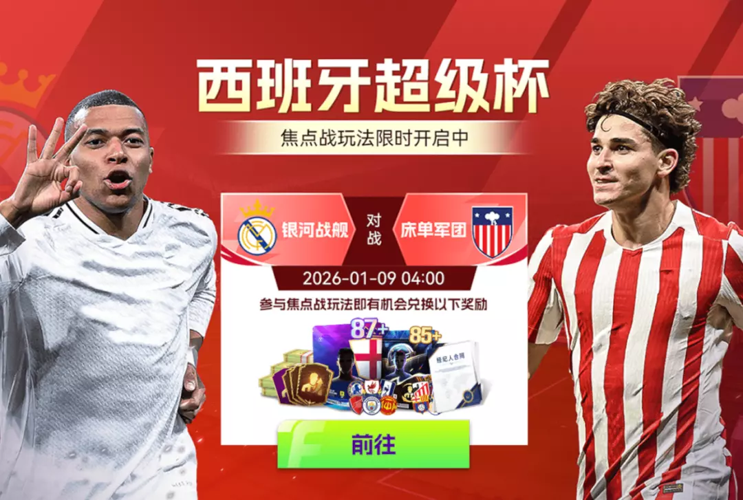 焦点战玩法限时开启中,参与各类玩法获取焦点战币,最高可兑换【87+】焦点战豪门混合球员包等诸多好礼。本期焦点战火药味十足——银河战舰VS床单军团,西班牙超级杯强强对话!枪手VS利物浦红,英超双雄对决!锁定赛事、加入竞猜、给出你的判断,这一次,谁才是真正的“大赢家”?