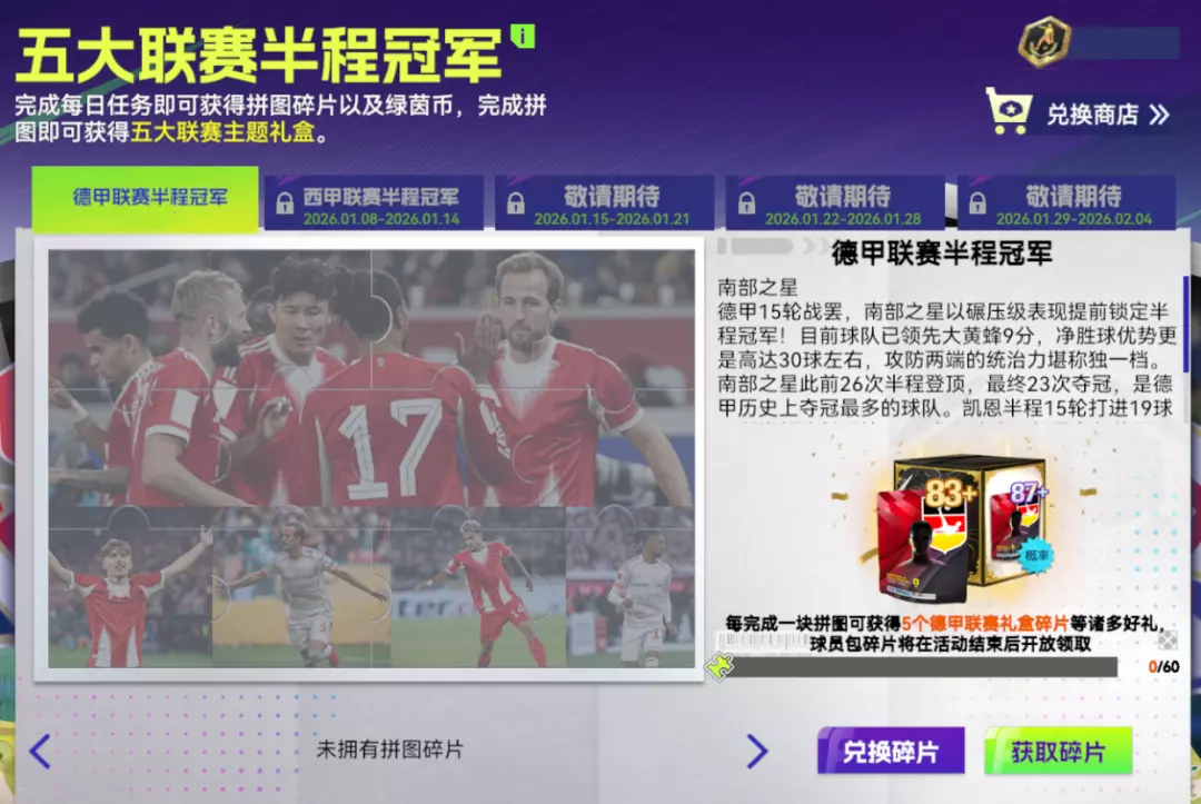 完成每日任务即可获得拼图碎片以及绿茵币,完成拼图即可获得五大联赛主题礼盒。南部之星用“碾压”两个字写下德甲半程答案,回望历史,26 次半程登顶,23 次最终加冕,拜仁已经把“冠军领跑”写进基因。 参与每日任务,拼出荣誉拼图开启礼盒——把优势变成胜势,打造属于你的冠军之路。