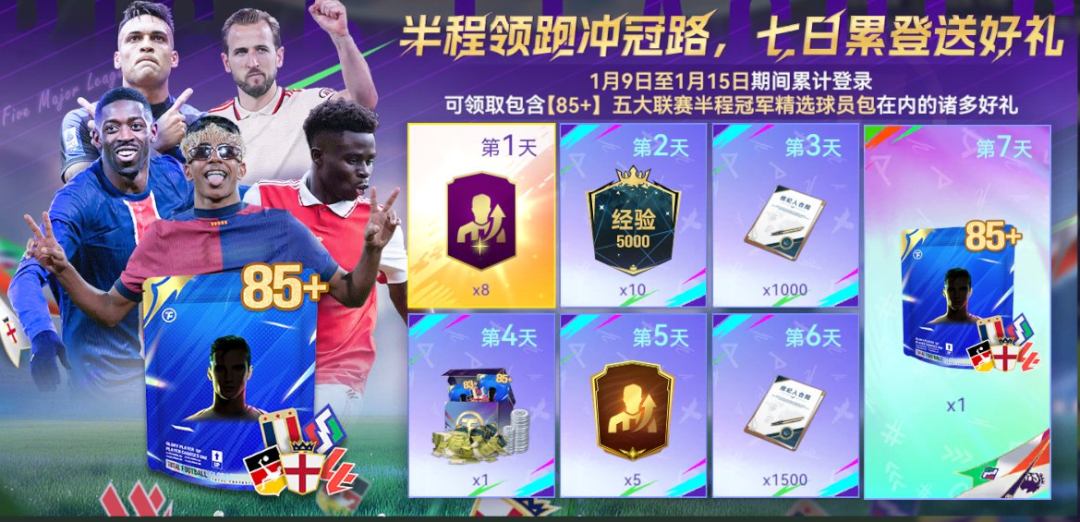 1月9日至1月15日期间累计登录可领取包含【85+】五大联赛半程冠军精选球员包在内的诸多好礼。 新的一年不只是数字翻页,而是战火重新点燃。2026刚刚开场,球会福利已经开始加速。只要连续登录,就有机会为你的新年阵容补强战力!