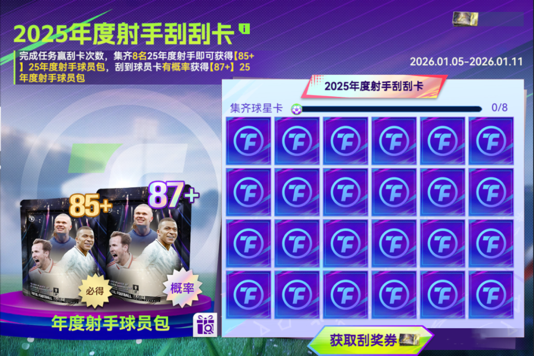 完成任务赢刮卡次数,集齐8名25年度射手即可获得【85+】25年度射手球员包,刮出球员卡有概率获得【87+】25年度射手球员包。每一次刮开,都有机会出现一位年度射手,参与活动就有把机会顶级火力收入囊中,让你的球队在任何比赛里都能所向披靡!
