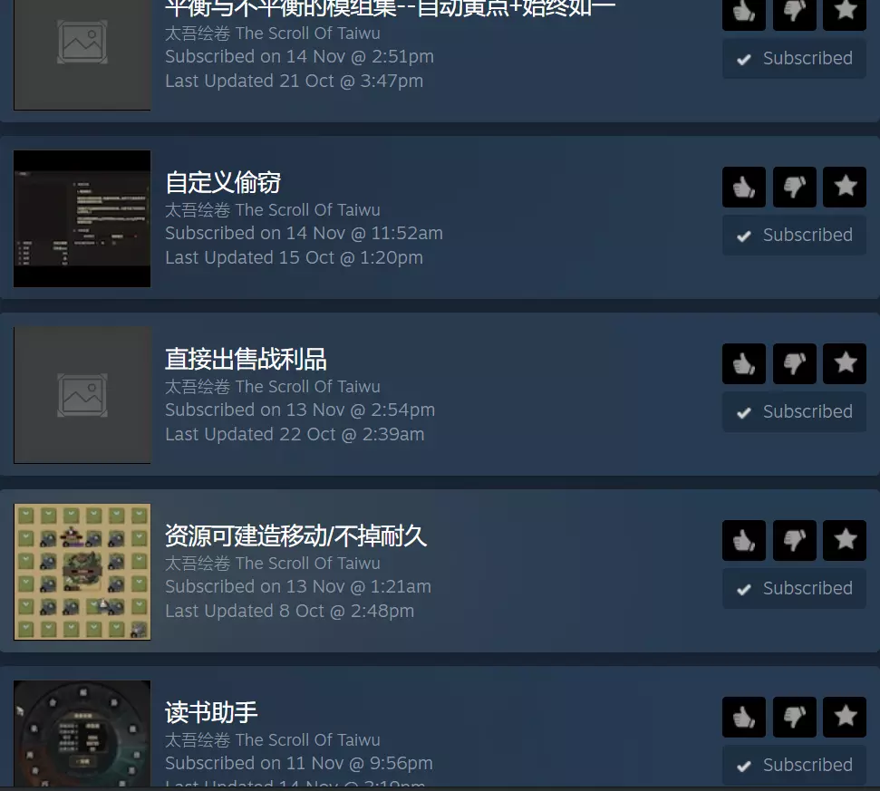 为英文玩家推荐的模组。所有模组相互兼容。已更新至游戏版本v0.2.6.18。 Unity Mod Manager 《太吾绘卷》目前不支持Steam创意工坊,所有模组必须通过Unity Mod Manager加载。 英文模组本体 基础资源模组:英文模组需要此模组。 英文模组本体。 如何安装英文模组。 风格图标:将风格图标从汉字转换为图片。纹理文件夹需直接放入游戏目录。需要基础资源模组。 翻译后的便利性模组:CharacterFloatInfo 1.5.1。MoreInfo_1.5.7(无需点击打开NPC属性面板即可查看其属性) ShowMeMore_v0.0.9.1(在背包/仓库中显示特殊标签而非耐久度) ShowMeMore_v0.0.9.1(显示技能、武器和蟋蟀的隐藏属性) 需要CharacterFloatInfo插件支持 Majordomo 1.2.9(自动分配村民,自动收集村庄内的收入) EasyRefine_v1.0.11(减少精炼过程中的点击次数) ScientificReading_1.1.0(显示每次操作的成功率和预期耐心消耗) ShowEffectInfoinBattle_0.7.0(战斗中显示已激活的步法和防御特技效果) GongfaEffectScan 0.7.1搜索游戏中所有技能或已学习技能的装备效果,帮助规划技能模板。智能穿戴1.1.6:可在不同情况下自动切换装备和技能模板。其他便捷模组仍为中文(操作简单无需翻译)。GameSpeeder 1.1.4:允许加快战斗速度。GongFaBook 1.0.10.1:显示每个技能的正邪效果。S/L管理器1.5.5:允许随时保存和加载。