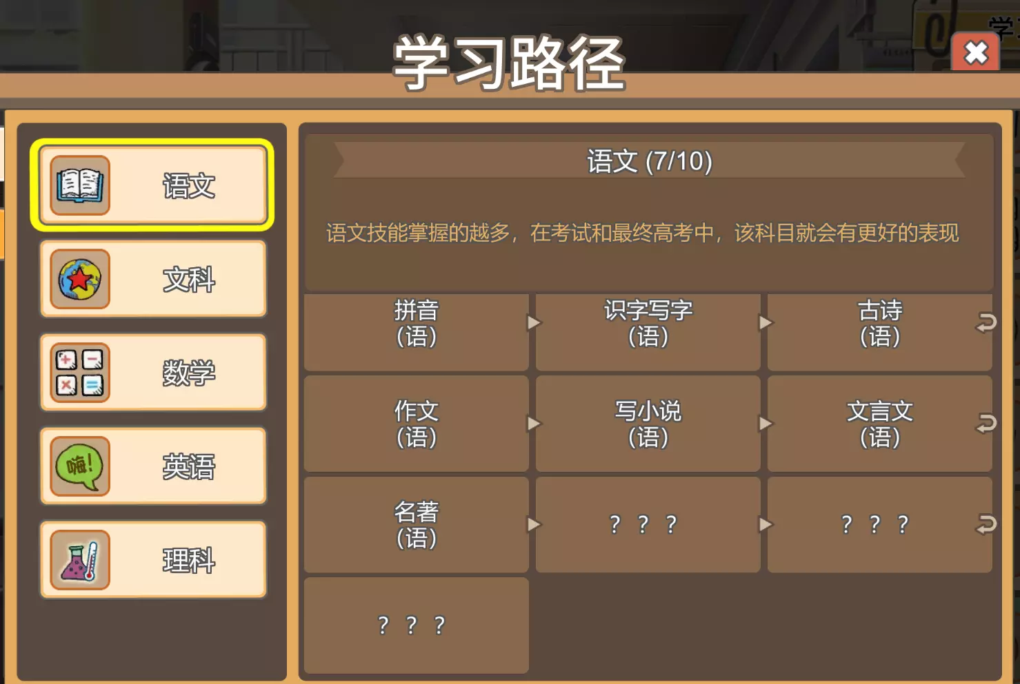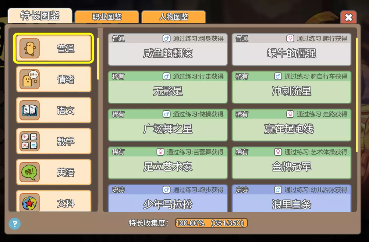 简易版从入手到入土攻略(过新手教程有助于阅读本攻略) 各职业属性要求来自网络,本人已全成就,图鉴差一个懒得再刷一代了 祝大家速通 以下为关键操作: 第一代固定是男孩:事项、脑洞属性(有悟性拿悟性)之类的前期选体魄,刷特长跑步【少年马拉松】、幼儿游泳【浪里白条】、弹钢琴【钢琴筋肉人】,选秀【少年马拉松】/【钢琴筋肉人】;索取后刷电子琴【五指琴魔】橡皮泥【夏娃的诱惑】,之后小学第一代大概率属性是不够挑战要求的,看一下第一个挑战打谁,如果是聪聪爸爸要攒钱,李同学妈妈免疫体育类特长【少年马拉松】这些,肖同学妈妈会免疫【五指琴魔】和【夏娃的诱惑】,再另刷两个绿色特长,如走路【无影足】等,如果是其他的,一直刷这五个特长,特长刷到了刷挑战属性,只要第一个打过了就五连回合挑战,期间尽量不要增加额外的特长。 第二代开始有传家宝,十一阶魔方给的蓝色特长尽量不要被克制,女孩不需要。最后几个回合商店买五年高考连刷两回合,索取黄冈密卷连刷。 之后就是刷图鉴,特产甚至可以带三连传家宝,前几个世代尽量选属性要求少的职业,比如普通人、白领、漫画四类之类的,天王巨星、歌后、国民级主持人、首富等几个,因为有体魄、魅力和较高属性要求,中间需要索取《骑马》娱乐连刷,不停的连刷直到体魄、魅力满足条件,因为体魄除了安排学习体育相关技能,很少增加,过程中甚至会因为体魄过低挖脑洞心情“生病”。 以下为简单介绍: 一、传家宝 1、从第二代开始可以选择,初始可佩戴3个,随游戏进展陆续解锁槽位,最多佩戴6个。传家宝通过游戏货币购买,随着世代增加而增加,增加的多少与高考分数、录取大学、职业、配偶情况未测试是否挂钩,因为游戏币是富余的。 2、推荐优先佩戴:①考前专项训练(降低高考课程学习悟性消耗)②灵光一闪灯泡(学技能10%概率不消耗悟性)③十一阶魔方(获得史诗级特长)④算盘(学习技能最低消耗降低10点)⑤名著大全(作文思维属性初始加100)⑥铁皮小青蛙(每回合压力-10) 备选:⑦八卦图(选秀可以猜特长得分)⑧凹造型指南(班干部竞选每一项初始选票增加1%) 二、技能、成绩及职业、谈恋爱 三、技能分为高考相关课程技能和职业技能,技能学习消耗悟性,高考课程学的越多考试成绩越好(高考发挥不稳定),成绩会影响面子,基本上跟回合轮次同步学就差不多,职业技能影响职业等级,同时受属性影响,比如演员→天王巨星,同时会影响少数角色谈恋爱。职业会影响下一代零花钱,并且有继承属性,谈恋爱下一代有继承属性,好感度较高时相亲三选一会出现,不用赌另外两个会不会同意。 三、属性及作文 ①智商②情商③记忆力④想象力⑤体魄⑥魅力 四维属性及体魄、魅力影响学习技能消耗、职业等级、写作文、父母期望、面子挑战、谈恋爱、心情;作文得分受属性影响(智商影响逻辑,情商影响文笔,记忆力影响思想,想象力影响想象),金奖银奖、安慰奖、入围奖会加悟性(传家宝佩戴名著增加得奖概率) 四、索取、面子、父母满意度、压力及性格、心理阴影和父母类型、期望 1、索取、面子、父母满意度、压力 索取受面子影响可索取项,且有成功概率;父母满意度为0、压力满100增加心理阴影,减少索取次数或零花钱,其中压力满100会导致负面性格;父母满意度满100、压力为0减少心理阴影,增加索取次数零花钱,其中压力为0会增加正面性格,性格会影响心情、世代结束相亲;心理阴影满会离家出走(我从来没打出来过over结局),负面性格与心理阴影增加是共同出现的,心里阴影减少、正面性格增加会逐渐顶替负面性格。 2、①父母类型:每世代结束时选择(两次机会),五种类型,有不同效果,建议:①忽视放养②父业子承(我从来没拿过,都选的忽视放养)②期望:属性要求、技能要求,达成父母期望奖励属性、行动力、悟性等,未达成无额外惩罚。 五、脑洞及试卷 1、层数4的倍数当天无法进入下一层,行动力用完第二天自动下一层,层数高了属性加成高,但是这玩意儿就是个宝石迷阵,优先拿悟性,所有的操作都是为了拿悟性,包括闪电随机恢复体力、爆炸清九宫格、眼睛清除迷雾、前往下一层恢复体力等,归根结底都是为了多拿悟性。此外,普通属性就是探路清迷雾的,问号可以赌,如果只有天赋和同属性收集,可以看哪个加的属性多。 2、初中以后开始有心情,充分利用,但是不是非要利用,还是那句话,多拿悟性。 3、试卷:简单的三合一小游戏,优先做120悟性的,个人感觉性价比较高。另外当前版本有小BUG,当场上颜色球满足两道题要求但只能提交一道时,你完成一道试题提交后,如果剩余的颜色球可以继续合成,会造成短暂试题刷新卡顿,这个卡顿可以用于提交另一道题,并且有概率卡出较高数字的颜色球。 六、零花钱及红包 1、来源:上小学后每回合根据父母职业给,压力清零、父母满意度满都有概率给。 2、用途:上小学后商店购买商品,降压力(随到达回合数涨价,三类商品,每回合可买两次)、加满意度(随到达回合数涨价,每个商品只可买一次)、娱乐、技能、谈恋爱(男生泡妞和女生事件)、面子挑战聪聪爸爸。因为满意度和压力奖励,每回合80够用了,如果要商店买贵的娱乐就稍微攒攒钱 3、红包:固定回合数过年,给零花钱,共两轮(100+200/200+100/200+200),失败0 七、特长及面子挑战、选秀 1、分类:白(普通,战斗力7)