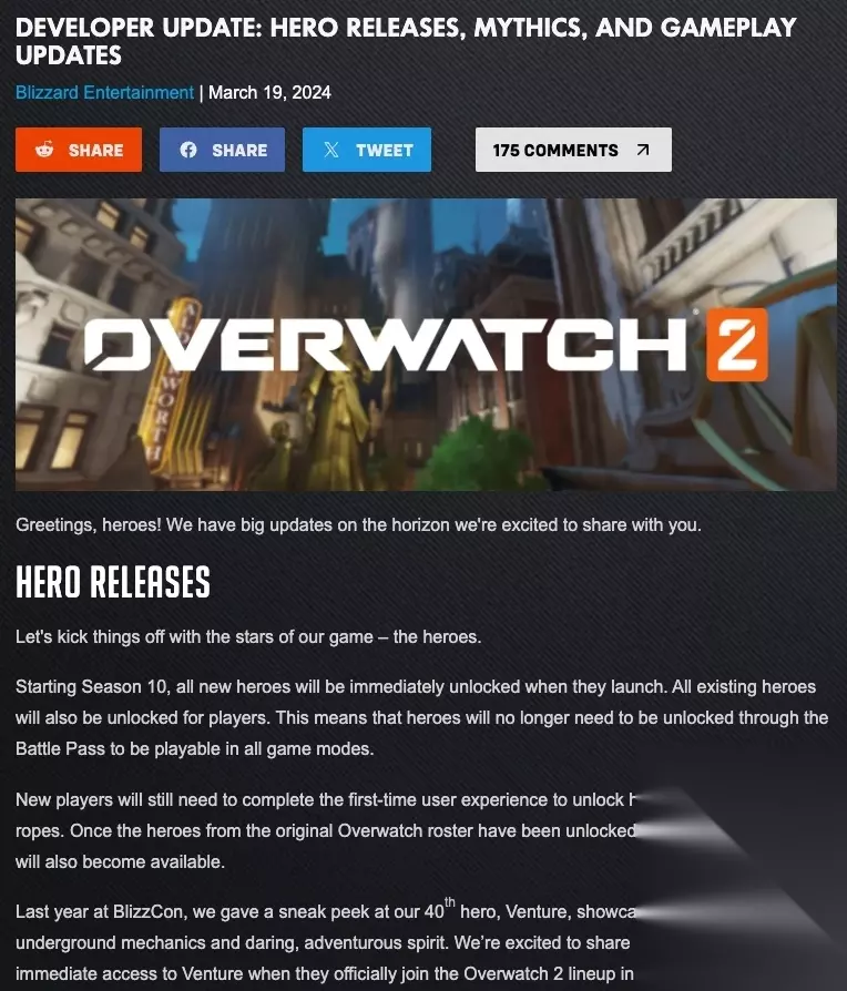 在一场新闻发布会上,暴雪也强调了对《守望先锋》的长期承诺。此前几年,这款游戏经历了一段艰难时期,一些重大新功能被取消或回撤,也逐渐失去了初代时期的部分热度。暴雪实时服务开发负责人Walter Kong表示:“我们把这项业务视为支撑《守望先锋》未来10年的长期项目,我们并不把它当作短跑,而是一场马拉松。”