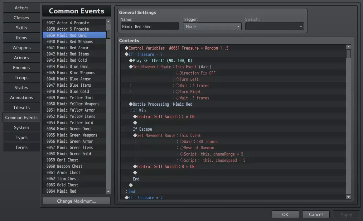 Did you have the idea of adding labyrinths to your game? Labyrinths are a fun way to keep the player engaged, however they may prove to be too much work. If you wanted to make two 3x3 labyrinths you would need 18 maps! Well, look no further. My mechanics can create random 3x3 labyrinths automatically using only two maps! The labyrinth will be generated as soon as the player enters it, and will remain consistent until the player solves it or forfeits it! Next time they will enter it, they will come across a brand new labyrinth with a different solution than the previous one! Introduction In this guide we will make a "machine" that generates randomized labyrinths that though remain consistent until the player either solves them or forfeits them. For this example we will always assume: -all labyrinths will have a total of 9 rooms. (VroomTotal=9) -all labyrinths will have the shape of a box. (VroomShape=1) -the entrance is from the bottom of the box, into room 2. (Ventrance=2) -the exit is towards the top of the box, out of room 8. (Vexit=8) -the solution only needs you to traverse the labyrinth and find the exit, without needing to find any items or press any buttons In order to better follow the logic draw a box of 9 squares on a paper and number them from 1 to 9, from bottom left to top right, so that room 4 is above room 1, etc. This way you will not get lost, especially in bigger labyrinths. Note: Once you create this example in your game, you can play around with different shapes, entrances and exits. Everything is randomizable! 1. Sample Room Create a simple square room with 4 exits: LEFT, RIGHT, UP, DOWN. Name it "Sample Room". This room will be our reference. This example will only use this room, but when you enhance your labyrinths you can use this as an example. Don't make it complicated, don't add columns and stuff like that. Just a simple room. This is the only room we need, however we will also make another one for simplicity's sake. Create a parallel event in "Sample Room". This parallel event will have inside it a Common Event called "Rules", a "FadeIn" command and the "Erase Event" command. 2. Transitional Map Create an empty map, without anything inside. Name it "Transitional". This room will be used only to ensure any parallel events in our Sample Room are restarted. When you become proficient with creating labyrinth machines, you will be able to bypass this room entirely, but for now we will need it. Create a parallel event in "Transitional". This parallel event will have inside it a "Transfer Player" command, with our "Sample Room" as a map, and variables (VposX) and (VposY) as the coordinates. 3. Common Event "Creation" Create a Common Event called "Creation". This will be called only ONCE per labyrinth, just before the player gets transfered inside the labyrinth. So, for example, as the player agrees to enter the labyrinth, the Common Event "Creation" will be called before the "Transfer Player" command. Inside this event, put the variables we discussed in the introduction: VroomTotal=9 VroomShape=1 Ventrance=2 Vexit=8 4. First Variables and Switches So, forget about the "Creation" for now, we will come back to it whenever we want to add something to it. Now we have to make our first rules. For these we will need: -Variable that holds the room we are currently in (VroomCurrent) -Variable that tells the game the room we are heading towards (VroomTo) -Switch that blocks the left exit (Switch LEFT) -Switch that blocks the bottom exit (Switch DOWN) -Switch that blocks the right exit (Switch RIGHT) -Switch that blocks the top exit (Switch UP) Before we do anything else, we already know where the player currently is in the beginning of the labyrinth. They are at the entrance, right? Let's pop this in "Creation" - it needs to be after Ventrance has been initialized. VroomCurrent=Ventrance 5. Directional Switches and Events Now, first of, let's put the switches into place. Create an event for each one of the exits. Each of these four events must be: -Trigger: Player Touch -Below Characters -Create 2nd page -Trigger: Action -Same as Characters -Image: a boulder or a door or something that blocks movement -Condition: Switch: one of the four directional switches we made, depending on where this exit is For example the left exit's 2nd page needs the switch "LEFT" as a condition. These 2nd pages will be activated when the exit is blocked. Later on we will see more of that. Remember that static images also need "direction fix" to be ticked, so that they don't change shape when the character presses the action button on them. Now, remember i told you to draw the box on a paper? Four things immediately come from that. -Each room to the left is one number lower than the current room's number -Each room to the right is one number higher than the current room's number -Each room to the bottom is three numbers lower than the current room's number -Each room to the top is three numbers higher than the current room's number Now back to our exit events. So far we kept the first page blank since we didn't have any rules. However now we have our first most basic rules. These are just directional so we won't put them inside the Common Event "Rules". Instead, we will put them right on the exits. When the player touches them, our machine needs to realize that the player is changing rooms, and where exactly is the player going. So. -Left exit needs VroomTo=VroomCurrent VroomTo-=1 VposX=i VposY=j FadeOut Transfer Player to Transitional - wherever "i" and "j" will need to be fine-tuned depending on the rooms you will be using. They are meant to give a sense of continuity to our labyrinth. In this room, they are the coordinates of the square in front of the right exit - since we are going left, we are entering the room from the right. All other exits need the same things. The differences are the VroomTo subtraction or addition as well as the i and j values. So copy and paste these commands to all firs