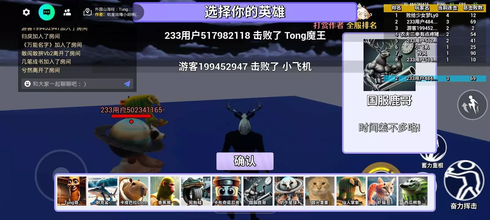 鹿哥太弱了,完全比不上原版的强度,原版比通哥还强,蓄力棍不能动太弱了,别人直接躲过去了, 我觉得可以移动比较好