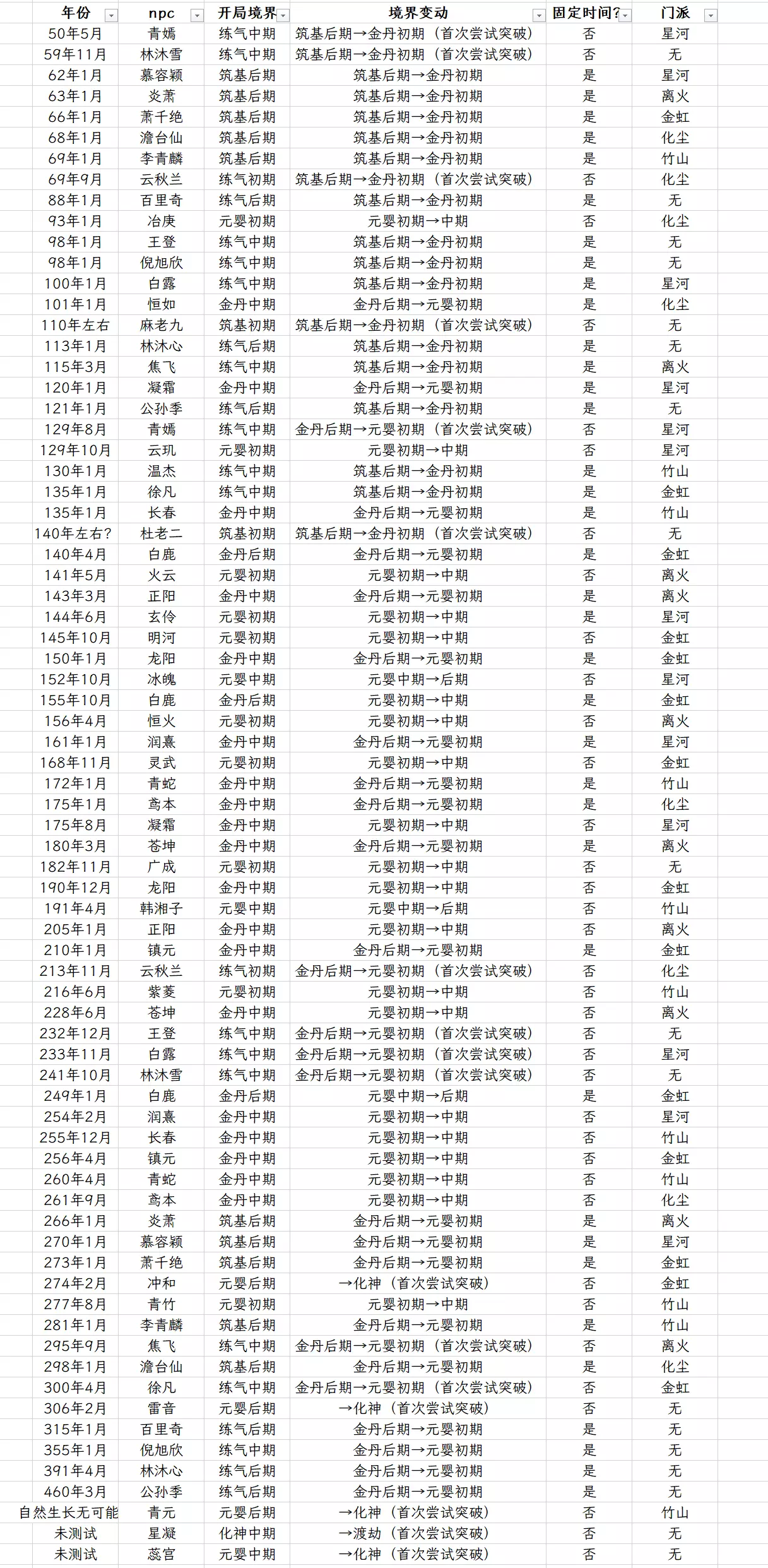 含有剧透,且剧透不作spoiler处理,介意勿入 之所以是指北,里面含有我个人在打剧情时的感想,且此攻略部分依赖于我的个人记忆撰写,有错漏之处请海涵 感谢金虹群群友在我编写此指南时的帮助 感谢残天佬提供的剧情文档让我补上了一些判定的具体条件 本攻略亦在觅长生bwiki上投稿,如果想看更精细的排版请移步bwiki 练气期可触发 通用支线1.封山之谜 条件:第一年英杰会获得冠军 开始时间:1年 关闭时间:5年 很简单的任务,去正阳山打一个同样是炼器初期的叛徒弟子,打完回白帝楼复命,选“古神教”“黑心老人”即可(选错不影响复命,只是少拿两本秘籍) 2.一仙道人 条件:无 开始时间:1年 关闭时间:120年 分别在3个不同的年份去找一仙道人,每次都选给他算命(100,500灵石),最后花2000买下涵虚仙府玉佩(120年后涵虚仙府任务道具,影响最终奖励) 一仙道人的出没地点:1月武陵城客栈,3月逸风城客栈,6月云汐城客栈,8月天星城客栈,11月广陵城客栈 3.调查武陵城 条件:第一次获得英杰会冠军 开始时间:1年 关闭时间:主角筑基任务即关闭,或者21年后仍未获得英杰会冠军 建议这个任务不要在年底做,接了必须在本年内完成 获得冠军后去白帝楼立刻触发,然后和武陵城客栈老板对话,之后见到李天的时候三个选项不影响后续,随便选 打赢后复命,选项分别是“李天”“魔神蛊”“ 古神教”后额外获得玄天剑(选错只获得灵石) 4.禾山灵猴 条件:遁速13以上 开始时间:1年 关闭时间:40年,主角筑基此支线即关闭 去禾山-幽谷触发剧情,选项选救猴子,获得一些药材 5.永安学堂 条件:无 开始时间:1年 关闭时间:98年 去永安镇地图中间的岔道往上,一直走到学堂,奖励20心境 6.星宫有铃(重要支线,强烈推荐做,影响的后续任务太多了) 条件:主角达到练气中期 开始时间:5年 关闭时间:23年 大地图金色卷轴触发,打一个练气魔修,获得一个上品法宝,要是你想打王登还挺有用的 获得一个原味面纱 7.两派之争 条件:炼气中期 开始时间:6年 关闭时间:100年或主角金丹此任务即关闭 先到地图上踩金色卷轴,然后到沂山-沂山派,第一个选项不影响剧情,然后选加入哪一边(沂山/禾山)加入禾山/沂山不影响加入宗门或白帝楼 注:选择加入哪一方必须在主角筑基前触发 -加入沂山分支 杜老二会让你买3颗化瘀丹(武陵城-灵药堂或npc身上购买) 然后是去沂山-沂山那里打架 之后是5颗火铜精(二品天阳火材料,广陵城-百宝行或npc身上购买), 最后会打劫百里家的商队,注意打劫并不影响主角与百里奇的好感,打炼气期的百里家修士 打完之后的奖励:可向杜老二索要微信以及沂山法门(内含很多攻略提到的悬灵术) 向杜老二打听那件东西可获得双鬼就在沂山,建议筑基再打沂山双鬼 -加入禾山分支 首先是1颗五柳根(云汐城-百草阁或npc身上购买) 然后是去九巍山-九巍山打散修(练气期) 之后是1颗九叶芝(云汐城-百草阁或npc身上购买) 然后去沂山-沂山派打架 打完之后的奖励:可向麻老九索要微信以及禾山法门(内含禾山经,500年之后有一个任务与此有关) 向麻老九打听那件东西可获得双鬼就在沂山,建议筑基再打沂山双鬼 注,并没有加入哪一方更好的说法,禾山经可以在大地图随机刷的不打你的禾山修士上请教,悬灵术以及夺灵诀可以在筑基的不打你的沂山修士身上请教 8.百里奇的邀约(比较重要,能做尽量做,影响后续一系列剧情) 条件:6年获得英杰会冠军(可选) 开始时间:6年 关闭时间:百里奇筑基,14年前 在英杰会上,遇到百里奇前选“打败你只需要两个回合”,打赢后选“是你太弱了” 打败百里奇后加微信,去广陵城-百里府赴约,奖励百里奇的好感(到熟悉) 若不参加本届英杰会仍可以去百里府,但是好感给得不够多且加不到微信,需自行到大地图寻找他加微信 注,建议87年前搞到百里奇微信和让他的好感达到熟悉(他固定喜欢提升体质和遁速的丹药,很好炼),否则后续的龙宫支线很麻烦 9.巫山魔影 条件:完成调查武陵城任务 开始时间:7年 关闭时间:主角筑基 倪旭欣会给你发微信,点开以后去白帝楼接任务,然后去巫山-山脚洞窟,两个选项如果学会毒系神通或者丹道到小成可以选择下毒,但后续少本秘籍,打两个练气后期的敌人 回白帝楼复命后获得灵石声望,若正面开打(不下毒)则额外获得破魔剑秘籍(地阶神通) 10.破庙相争 条件:主角达到练气后期 开始时间:无 关闭时间:主角筑基 如果你在突破练气后期前有散修朋友的微信,概率地朋友会给你发微信,获得一条传闻,获得传闻与否不影响是否触发剧情 去九巍山-破庙触发剧情,答应黑心老人,然后点休息 天邪子就是个dps检测仪,普通难度下建议拿调查武陵城获得的剑去打会相对轻松一些,他前7个回合不动,所以尽力输出即可 打败会掉落巨额奖励,黑心老人的奖励建议选法宝,给个还算可以的盾,功法是一本残缺的地阶功法,但是没什么用,是否获得不影响后续在500年他给我们完整的功法 然后去白帝楼报告(什么时候去都可以)获得一笔前期来说不菲的灵石 注,若不做这个支线则黑心老人死亡,500年宁州古迹里不会出现 11.公孙季英杰会 条件:11年获得英杰会冠军(可选) 开始时间:11年 关闭时间:(不确定,应该是公孙季筑基前都可以) 无论是否在11年打败公孙季,去听雨阁触发,选兴致缺缺,然后去公孙府 一开始的选项不影响,随便选,然后问和哪里像的时候选听雨阁 怎么说呢,公孙季是个相对难找