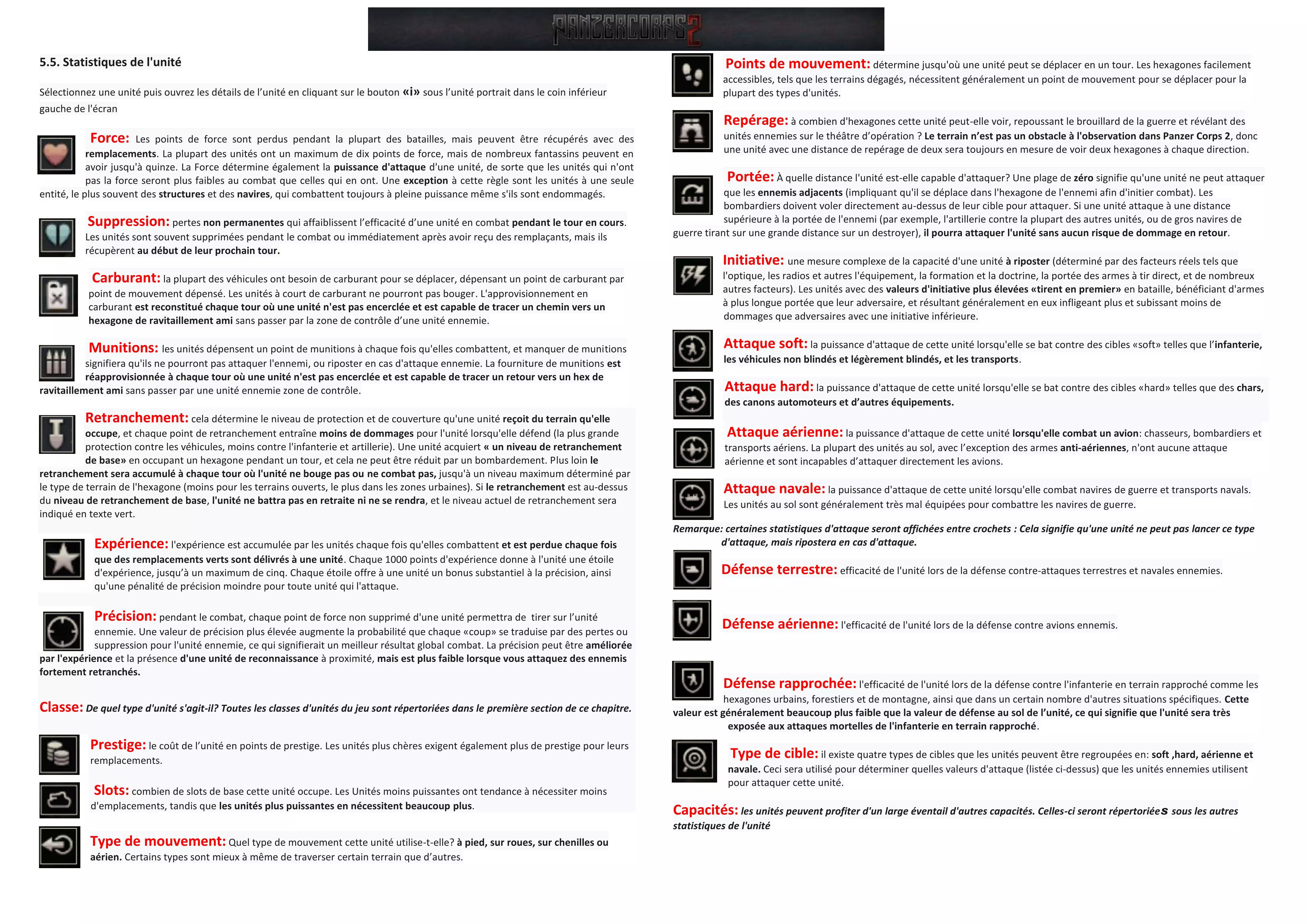 A list of traits found on Heroes in PC2 I don't think this is all of them just all the ones i have encountered so far and their in-game descriptions Traits List Traits List: AA Support - Provides support fire against air to ground attacks. Will shoot at any fighters and bombers attacking friendly ground units within its firing range Aggressive Counterattack - +3 attack when defending Aiming Assistance - +10% accuracy to all adjacent friendly units All-Terrain Entrenchment - Entrenches in any terrain with Maximum speed Alpine Troops - Gets +5 attack and +5 defense in hills and mountains and also ignores enemy High ground bonuses and entrenchment in such terrain (Unit Trait) Ambusher - Always Triggers an Ambush when attacked Artillery Support - Provides support fire to adjacent friendly units attacked by enemy unarmoured units (with "Soft" target type). Anti-tank support: the unit provides support fire against hard targets (basically the same ability as tank destroyers) Avenger - Gets attack bonus for each point of lost strength Bridging Unit - Acts as a bridge when positioned on a river (Unit Trait) Bunker Killer - +5 attack against structures (Unit Trait) Butcher - +5 attack against infantry units Camouflage - Can only be detected by recons or adjacent ground units Cheap Replacements - Replacements in battle cost as on deployment phase City Fighter - Combat Bonus in city terrain Close Combat - Has access to enemy unit's close defense rating when fighting in close terrain (Unit Trait only) Combat Luck - Combat Results can never be worse than predicted Counter Battery Fire - Will fire at any attacking artillery units within its firing range Crippling Blow - +5 Attack against full strength units Distraction - Enemy units next to this unit do not provide support fire Double Attack - Unit gets 2 attack actions per turn Double Mass Attack - When participating in Mass Attack, contributes double effect. Double Move - Unit gets 2 move actions per turn, without increasing the number of movement points Double Support - Provides support fire twice for each enemy attack Entrenchment Killer X - Destroys X points of entrenchment with every attack Entrenchment Support - All adjacent friendly units entrench at 2x speed (Unit Trait Only) Envelopment - Prevents enemy units from retreating, so they surrender instead Evasive - -10% accuracy to enemies shooting at this unit Expert Recon - Provides 3x accuracy bonus on adjacent enemy units Expert Support - +20% accuracy when providing support fire Exterminator - +5 attack against units below 50% strength Famous - Generates 20 prestige per turn Fast Deployment - can unmount from organic transport and fire after movement Fast Entrenchment - Gets 2x entrenchement speed Fast Learner - 2x Faster experience growth Fast Rebase - Aircraft does not spend Move Action on rebase Fast Retreat - +2 movement points when unit's strength is 33% from maximum Fearsome Reputation - All Adjacent enemy units get +3 suppression at the beginning of their turn Ferocious Defense - Entrenchment of this unit cannot be ignored Field Repairs - Restores one point of strength every turn the unit did not attack. Applies to Vehicles Fierce Fighter - +1 attack for each adjacent enemy unit Fighter Suppport - Provides support fire against enemy fighters attacking friendly bombers. Will also intercept enemy bombers attacking friendly ground units in adjacent hexes (Unit Trait only) First Aid - Restores one point of strength every turn the unit did not attack. Applies to Infantry. First Strike - Unit always attacks first Flag Killer - +5 Attack when attacking enemy flags Glider - Can Land and disembark the unit it carries on any land hex, not just airfields. Exceptions are hexes which are impassable for embarked unit. Hit and Run - When attacking, enemy units with the lower initiative do not shoot back Ignores Entrenchment - Ignores enemy entrenchment level Ignores ZOC - Ignores zone of control projected by enemy units when moving Learns from Mistakes - 3x experience for suffered casualties Lethal Attack - Half of suppression caused by this unit is converted to kills Liberator - 2x prestige for all flags captured by this unit Lightning Attack - Immune to all types of support fire Low Profile - Enemy units get -20% accuracy when shooting at this unit No Entrenchment - Unit does not entrench No Surrender - Unit never surrenders No Retaliation: enemy units will not return fire if attacked by that unit Overrun - Can destroy (Overrun) weakened enemy units without spending move or attack actions. The way it works is, after and overrun attack, move and attack actions of the unit will be replenished Overwhelming Attack - Any Damage to enemy units is enough to force them to retreating Phased Movement - Can move in steps within its movement point limit (like recon) Provocator - Adjacent enemies attacking other friendly units will attack this unit instead Prudent - Gets defense bonus for each point of lost strength Rapid Fire X - Makes X more shots than normal and consequently deals X damage to the target. This trait does not affect ammo spending, the unit still consumes 1 ammo per attack Readiness - Strikes first when defending Reduced Slots - Unit slot cost is reduced by 50%. River Fighters: Ignores Battle Penalties through River Fields Scavenger - Captures 2x equipment from surrendering enemies. Shock Tactics - When attacking, pins enemy unit in place by destroying all its movement points Sixth Sense - Immune to Ambushes Superior Manuever - Gets +1 initiative for each point of movement speed advantage over the enemy Tank Killer - +5 attack against tanks Tenacious Defender - +1 defense for each adjacent enemy unit Thorough Preparation - Initiative bonus +5… +1 on the first five turns of every mission Unyielding - Unit cannot be suppressed by enemy fire Vigiliant - Prevents enemies from using unit's Close Defense rating Vulnerable Target - Enemy units always shoot at this unit with 100% accuracy Zero Slots
