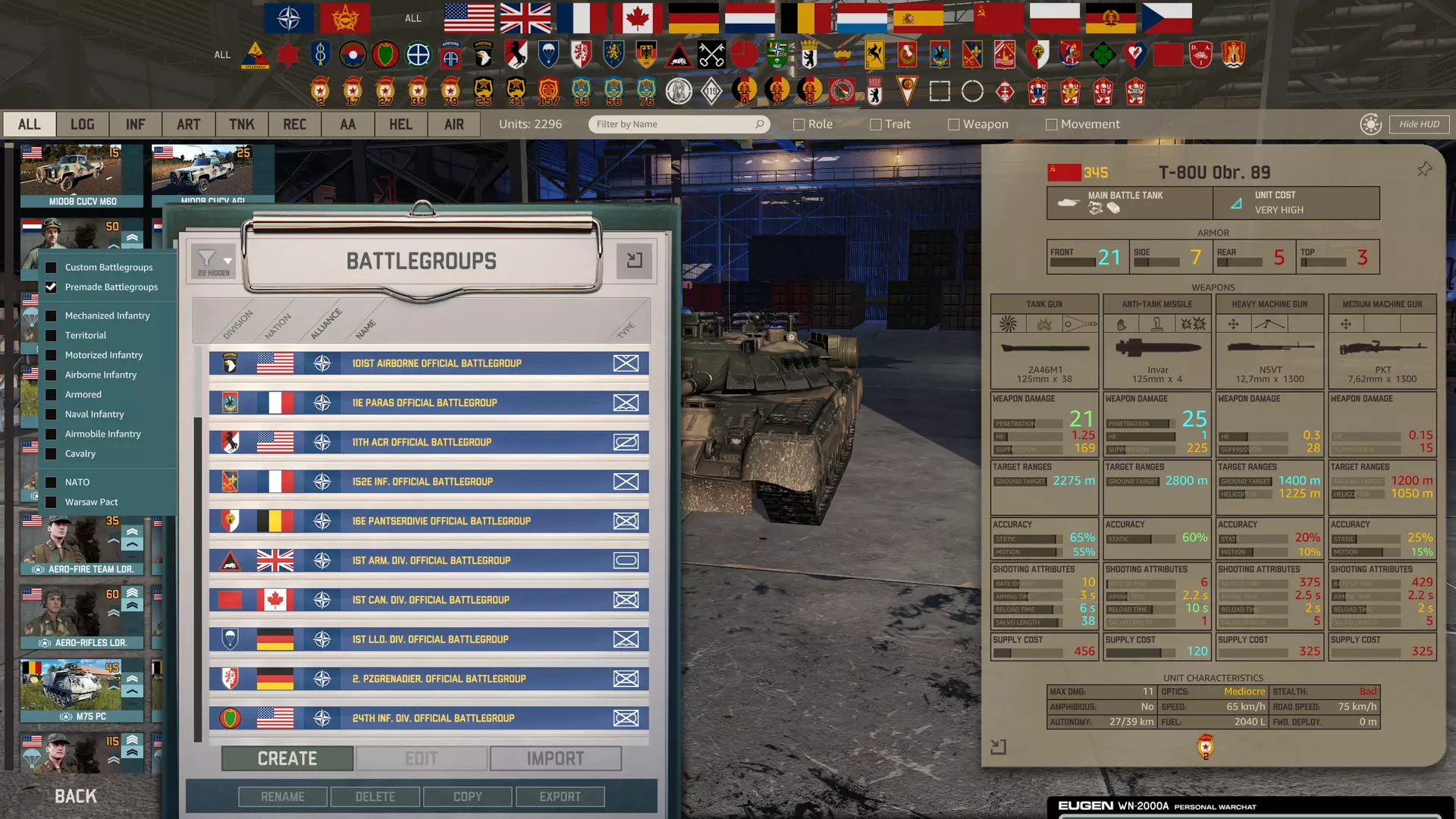 This guide is a tactical guide on RebsFRAGO, a realism modification for WARNO. As the mod creator, I will cover the changes the mod makes, the methodology I have for creating this mod, the utilities of various units, basic small tactics for defending and attacking. I also outline some of the macro strategies you may seek employ or emulate in order to better gain an edge over a human opponent, and to develop those strategies in coordination in the effort of a team. I apologize that this guide may read like a book with few pictures. I would rather spend my time building high quality mods for players than spending a day cutting and pasting in paint.net. Eventually I will add pictures or screenshots as I get them, and add new information as more experience with the mod is gained by myself and other players. Mod Summary The primary objective of Reb's FRAGO is to accurately represent the weapons and equipment of WARNO without compromising their quantifiable capabilities for balance. Every weapon statistic, from accuracy, to unit speed, dispersion, effective range, damage, suppression, reload speed, aim time, cyclic rate of fire and area affect radius are all copied or calculated from real life data to maintain full consistency. Balance is done through curves in calculation of interpretive factors, (ie, RNG accuracy, suppression) and economy changes. RebsFRAGO attempts to model weapons and assets accurately so that that real world experience and strategy can be directly translatable to the game. As the mod creator for this and other "realism" mods for many other games, I believe that "realism" doesn't prevent balance but is actually the best basis for it when it is applied with consistency. Consistency is accomplished by taking real life data, and, if necessary, applying calculations to them in order to appropriately translate or scale them to a game. If there is an "imbalance" with a particular item or unit, then I will check its attributes for consistency with my calculation, and if it is correct and persists as an issue, then I will create a new calculation and reapply them consistently across the board for all items of the same type. No value is entered arbitrarily. Fine tunes to balance are then adjusted through the game's economy, such as the command point price of units. This methodology to mod creation can be extremely time consuming and takes much more effort than many game developers actually spend themselves on the modified items. However, it saves time on the back-end from an endless loop of knee-jerk "balance" tunes, and players get a quality product that produces consistent result from their knowledge of the game's real life counterparts. Real life experience becomes translatable, and makes the game easier for more people to master. The second objective of this mod is to facilitate the slower, more tactical style of game-play for WARNO with the new realistic weapon values. Skirmish parameters are changed to allow longer games (1-3 hours), so that players can develop front-lines, cause attrition victories, use small unit tactics, and coordinate grand combined arms attacks. Mod Changes Weapons - Weapon maximum ranges based on real weapon maximum effective range, including infantry antitank and radar guided missiles. Range is still scaled by vanilla, this is not something I have been interested in changing in order to maintain viability of all units and diversify strategies on maps. - All ballistic weapon damage is based on real projectile size. - Explosive weapon damage is based on real warhead/blast charge size. - Ball, SABOT, & APFDS no longer have area of affect radii and must hit the target to kill. - HEAT/HESH projectiles have halved blast area of affects in composition to equivalent size HE projectiles. - Explosive area of effect is based on warhead/blast charge size, with the damage at the outer radius of the area of affect scaled to 1% to model shrapnel. - Area of affect distances are in general around half vanilla size. Armored vehicles no longer get blown up by 155mm shells 50+ meters away. - Suppression radius is based on area of affect. - Suppression damage based on weapon damage with a curve. - Weapon dispersion is based on effective range, two direct fire weapons will have the same dispersion radius at each of their respective maximum effective ranges. - Reload times calculated by weapon type and ammunition size. Auto-loaders can reload 25% faster than a manually operated gun of equivalent size. Auto-loaders take extra time to reload their salvo when the auto-loader is depleted. - All weapons have their correct cyclic rates of fire. - RNG accuracy calculated with cyclic rate of fire and weapon size. Higher rate of fire weapons of the same type and caliber have a lower accuracy per shot, but better damage efficiency due to their rate of fire. - Limit on successive RNG hits removed. - ATGMs can be fired relatively rapidly in a salvo, but have long reload times. - Disposable AT rockets take longer to aim than their reloadable counterparts due to the necessity for the rockets to be prepped, but can be fired in a rapid salvo. - Moving accuracy unstabilized is about half of static accuracy. This is to both cushion micro and account for fire and maneuver, as well as help offset the tremendous defensive bias this game has. - Units have appropriate combat loads of ammunition. - Suppressed weapons are actually suppressed. - Open bomb bays increase radar signature. - Hitrate modifiers are made such that combat is sustained at longer distances, and much shorter at close. This is to model cover being circumvented, and incentive players to close with the enemy in order to destroy them. Detection - All optics levels are graduated evenly. - Thermal optics are modelled by an additional optics level. - Time to identify target increased to better model the fog of war. Most enemy units will not be identified. - Stealth levels are graduated evenly on an exponent, infantry can get within 20
