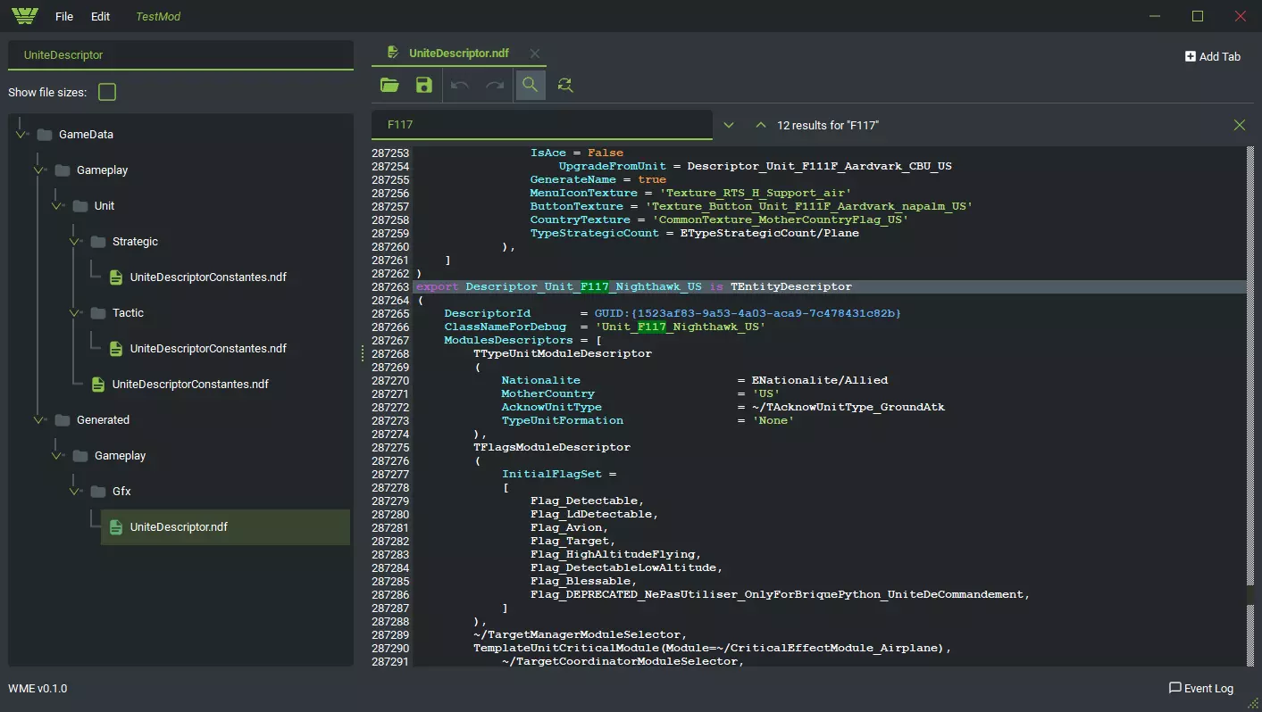 -WIP- WE ARE LOOKING FOR CO-CONTRIBUTORS WHO WOULD BE INTERESTED IN COMPLETING THIS GUIDE WITH US If you are interested in helping us please reach out in the comments ! This guide will go through all the main steps in modding for WARNO. Either you want to simply modify an existing configuration or create something from scratch such as a unit, weapon, etc. Introduction -WIP- WE ARE LOOKING FOR CO-CONTRIBUTORS WHO WOULD BE INTERESTED IN COMPLETING THIS GUIDE WITH US If you want to help, please reach out in the comments! (there is no small contribution) This guide will go through all the main steps in modding for WARNO. Either you want to simply modify an existing configuration or create something from scratch such as a unit, weapon, etc. The different parts will be progressively filled in the next months. If certain topics are not yet covered and you would like them to be, please leave a comment and we will take it into consideration. ToolsTo mod WARNO you will need some tools to edit .ndf files. This format is proper to Eugen Systems. All in one solutionThe modding tool Warno Mod Editor (WME) regroups all the needed editing tools with an integrated GUID generator for required unique IDs. https://steamcommunity.com/sharedfiles/filedetails/?id=2940069336 AlternativesIf you prefer other tools you will need ... A text editing software, such as : - Sublime Text - NotePad++ - Etc. A GUID generator. GUID are random IDs that allow each element to have an unique identification. https://www.guidgenerator.com/ Useful linksWARNO DataThis WIKI gives a description of all major attributes and mechanics available in the .ndf files of WARNO. While we will go through all the data in this tutorial step by step, this WIKI is always useful to have a reminder on what means what. https://github.com/Dreamfarer/WARNO-DATA/wiki WARNO ArmoryA recap of all units statistics from the base game. Useful to learn all the different data and what they mean in context. You can also use the armory to give yourself an idea of how unit are balanced. https://warno-armory.com/ WARYESSimilarly to the previous link, you can take a look at the data of all game units and have a look at some hidden values not viewable in game. https://war-yes.com/units Initial Setup - Create your mod In this part we will go through the initial creation process of your mod. Those steps are also available in the modding manual provided by Eugen Systems. First go to the "Mods" folder in the game files of WARNO on your computer: X: SteamLibrary steamapps common WARNO Mods Inside you will find two PDFs we highly recommend you to read : - the "Modding Manual", that gives a first look on how to mod the game (we will go through all the steps more in detail but if you want to speedrun modding with a surface explanation the guide provided by Eugen Systems is for you) - the "NDF Reference Manual", as explained previously you will go through .ndf files that is the text based language developed by Eugen and used in all scripts, this document gives you a basic understanding on how the language can be understood. Creating a new modThis part is mostly taken from the modding Guide provided by Eugen Systems. Go to the game installation directory (in steam: Library → WARNO → Properties → Local Files → Browse Local Files), and enter the Mods subdirectory. Open a console in the Mods directory (either by using cd <path_to_Mods_directory> or by shift + right-click in windows explorer > "open console here" or by typing cmd in the path bar of the file explorer while in the folder) and run CreateNewMod.bat with the mod name as argument. Example: CreateNewMod.bat MyAwesomeMod The name must be unique ; it will not work if a directory already exists with that name. If all goes well, you should see a message indicating that the mod was created, and a new directory named MyAwesomeMod has appeared. It should contain the following directories: • CommonData • GameData and the following files: • base.zip • CreateAssetDefinitionFiles.bat • CreateModBackup.bat • GenerateMod.bat • RetrieveModBackup.bat • UpdateMod.bat • UploadMod.bat These 7 files (base.zip and the 6 .bat) are part of the modding tools, please do not modify them or you will likely compromise your mod. If something is missing, try to delete the mod directory and recreate it. Create a weapon Create a Unit Depictions and ApparancesThe front facing of your units how it : looks in deployment, in-game, as a cadaver, in the armory (showroom), how it sounds, etc. In the UniteDescriptor you can see we have different descriptors and link files to modify/create : ApparenceModel - Depiction - ReferenceMesh - BlackHoleIdentifier TCadavreGeneratorModuleDescriptor - CadavreDescriptor TShowRoomEquivalenceModuleDescriptor - ShowRoomDescriptor Depiction"Depicition" is the list of all sounds, FX, meshes, etc. to be assigned on your unit Files to modify vary depending on the type of units : - For a vehicle, detailed in the following parts - For a plane and helicopters, similar to vehciles but some separate .ndf files in GameData Generated Gameplay Gfx Depictions .... with "Aerial" in the name - For infantry, similar to other but files can be found in GameData Generated Gameplay Gfx Infanterie - For towable Note : If you don't have any 3D model for now and/or want to use an already existing in-game model, there is a lot you can simply re-reference. However, depictions include sounds and other variables per attached weapons. If you modify a units' weapons you should create the associated depiction to ensure no crashes or bug. The following parts detail the process for vehicles. Their are variations of files for the different types of units listed bu the logic is similar. In the GameData Generated Gameplay Gfx Depictions DepictionVehicles.ndf file, you can copy a similar vehicle on which you can base yourserlf to start. You should have : - first, one DescriptionOperator per weapon used on the unit - then the export of