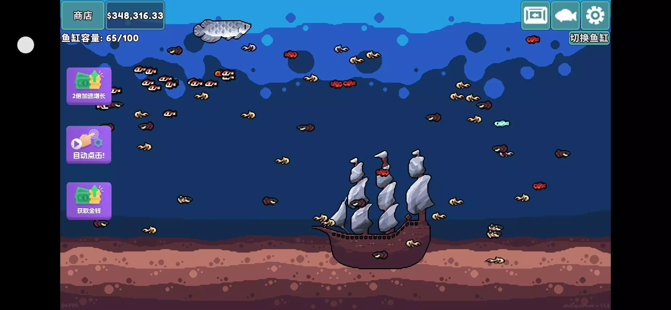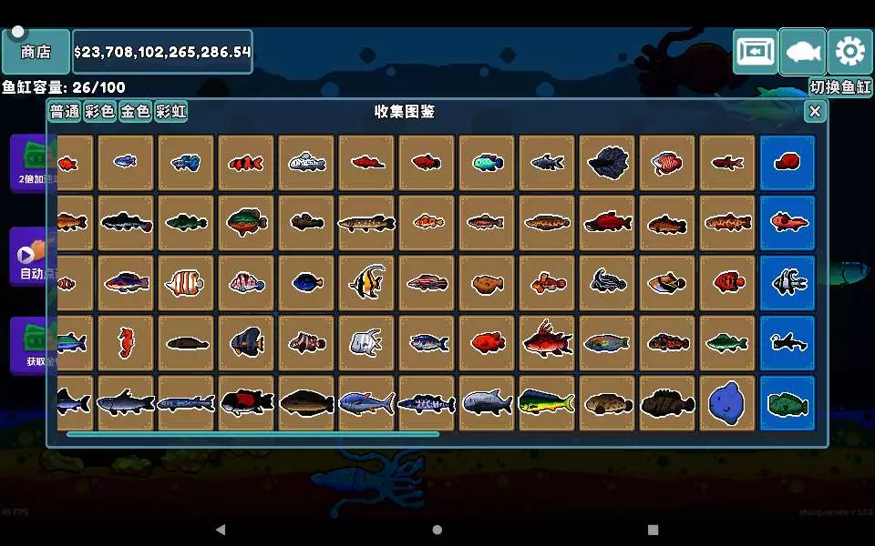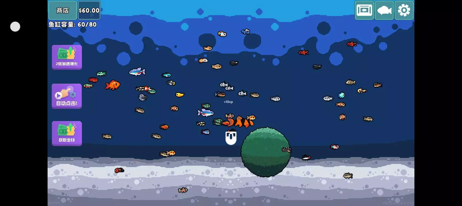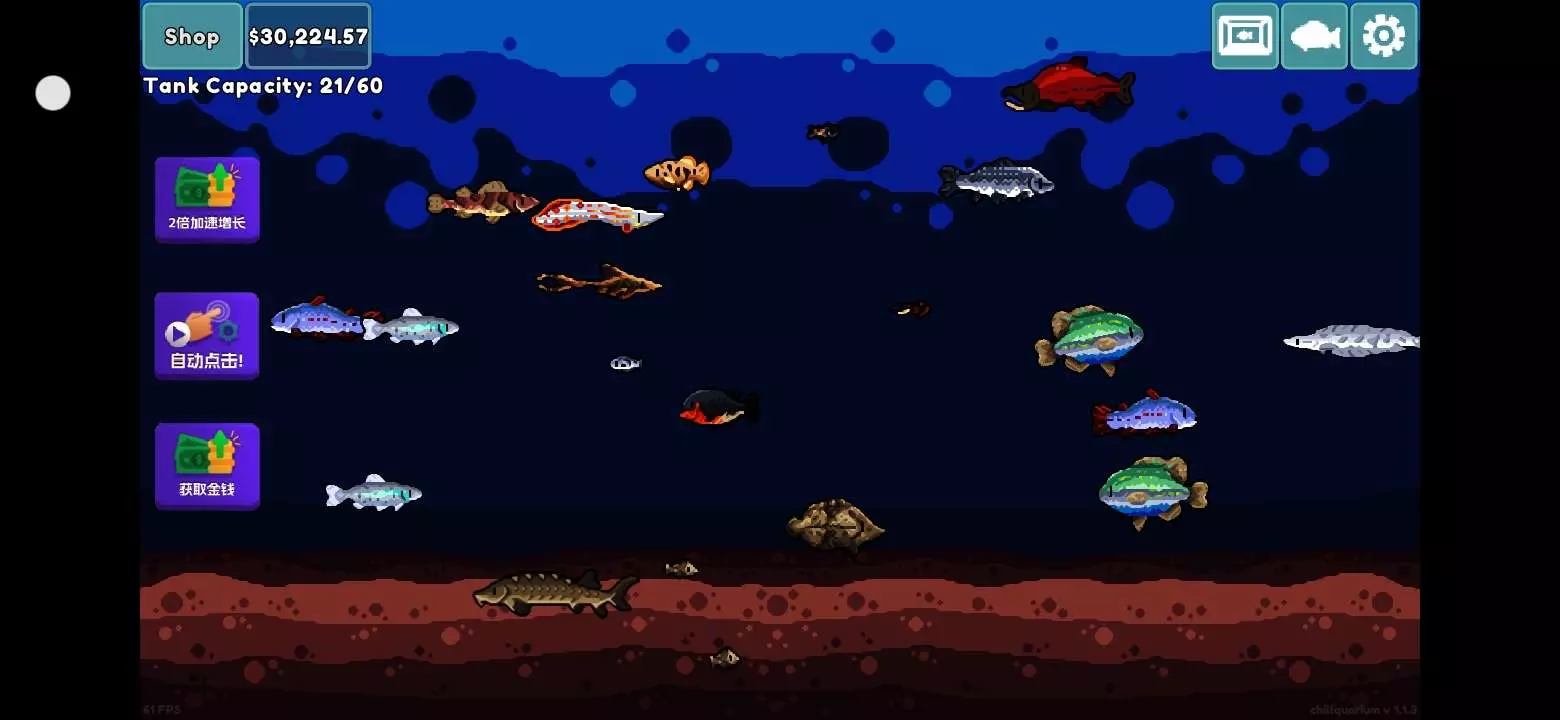 #种草吧玩家 这是一款养鱼挂机类游戏,个人觉得挺好玩的,开局需要买鱼苗,然后开始养鱼,不停的点击屏幕养鱼,等于长大之后还能带来收益,总之就是非常的好玩,喜欢养鱼挂机的赶紧充吧!
