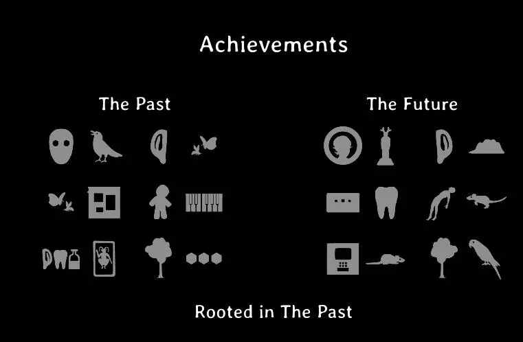 弹奏多个音符钢琴 内在听觉(与剧情相关) 将耳朵放入机器并送往未来 破碎 将昆虫(蜜蜂或蝴蝶)困在其中一个齿轮的隐藏隔间内 死眼(与剧情相关) 将针刺入巫毒娃娃的眼睛 隐藏成就⭐ 首次尝试就将3颗宝石正确放入机器 解决方法:⚪ 植根于过去 完成第2章并观看完整片尾字幕直至致谢 未来 - 第1章 吱吱声 多次点击老鼠直至它发出吱吱声 是谁?完成玻璃门试炼后,通过窥视孔观察,然后点击罗丝让她给你一个惊喜