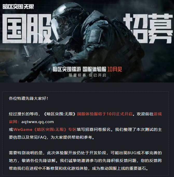 《暗区突围:无限》端游国服体验服测试资格招募现已开启,并将于10月开测!