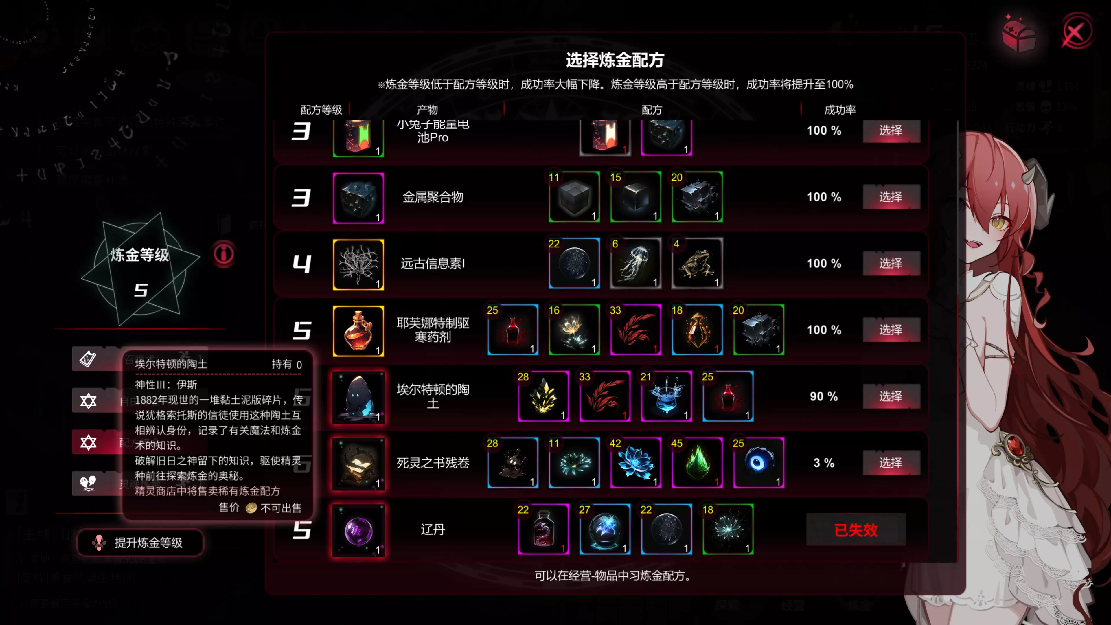 已施工内容包括:1.基础数值及其设定、2.山林探索奖励、3.矿洞挖掘奖励、4.菜谱研发配方、5.懒人餐厅经营、6.特殊庭院任务、7.客人图鉴、8.超凡物品图鉴、9.至高神谕图鉴、10.成就存档(评论区) 指南区其他几位大佬制作的攻略已经相当详尽了,重复内容我这里便不再施工,主要内容偏向为一周目开荒玩家提供部分机制设定的讲解(摆烂方法),不含剧透内容,希望各位在开荒过程中可以少走弯路,愉快游玩。 基础数值 金币 两大货币其中之一,用于各种用途 主要获取途径: 旅馆每日结算房费 餐厅销售菜品 屠杀房客掉落(如提前手动收取房费则屠杀不获得金币) 在奸商处卖出炼金材料、精灵币等(售价受到神谕-奢耀之龙影响,最高提升30%) 神谕-达贡的金沙(一次性收入) 神谕-达贡的眼泪(每日获取定额金币) 灵魂 两大货币其中之一,主要用于超凡物品的拍卖 主要获取途径: 灵魂炼金提炼灵魂碎片 获得超凡道具凯西露达之歌(可在第五次嘉年华中拍下)后卖5级菜品 屠杀房客直接获取灵魂 嘉年华拍卖自身超凡物品所得 san值 老生常谈的理智值,根据数值不同获得不同倍率的加成 0-25为癫狂,出现更多稀有客人,客人留下物品概率、收取房费/屠杀客人获得的金币极大幅度提升,打扫卫生获取整洁度降低50%,3级小叶子房间打扫卫生获取整洁度+105(-105) 26-50为错乱,出现更多稀有客人,客人留下物品概率、收取房费/屠杀客人获得的金币大幅度提升,打扫卫生获取整洁度降低30%,3级小叶子房间打扫卫生获取整洁度+147(-63) 51-75为异常,出现稀有客人,客人留下物品概率、收取房费/屠杀客人获得的金币提升,打扫卫生获取整洁度降低10%,3级小叶子房间打扫卫生获取整洁度+189(-21) 75-100为稳定,不出现稀有客人,打扫卫生获取整洁度100%由于低san值提供的强力buff存在,个人理解是san药充足的情况下卡在错乱和癫狂状态吃高额加成 另外,初次san值归零后会强制进入特定剧情,类似首次保护机制,第二次san值归零时如未拥有至高神谕-彼岸回魂则直接进入结局-归于门。 整洁度 下限0上限1000,只作为每四周结算时的考核依据,归零后无影响 更新后整洁度考核标准改为600,因此仅需要在每四周最后一个周日结算时保持600以上即可提升旅馆等级,注意:评审旅馆等级前会先计算当天房客扣除的整洁度 控制整洁度的手段,仅供参考,不唯一 提前预留充足行动力进行打扫卫生 使用家政服务券回复 在每次评审前最后一个周六撤走餐厅所有食物并取消勾选自动补充(减少周日基础客人数) 恶值 下限0上限100,影响剧情中的某些抉择,以50%为分界,1-50%和51-100%分别进入不同结局线,可通过在商店购买的赎罪券回复,如需在一个档打通善恶两种结局则需要准备0-5张赎罪券,具体数量根据当前恶值决定 客人数 2-4层旅馆由升级前台解锁,5层旅馆由至高神谕-丰饶解锁,旅馆房间最高等级为5最高容量4 幻境泡由超凡道具-无限泡沫(无魂的泡泡获取配方)解锁,单个幻境泡最高等级为1最高容量为1 无论是普通房间亦或幻境泡都收到普通/特级/至高神谕-多产的叠加buff 行动力 初始1最高3,游戏中进行大部分操作都会消耗行动力,行动力归零则自动进入下个时间段, 至高神谕-古神的低语和外神的低语分别永久提升白天和夜晚1点行动力 能量饮料可主动回复1点行动力,能量饮料由特殊客人-体育生携带以及自由炼金小概率产出 女主好感度 影响剧情中的某些抉择,如好感度不足则不出现该女主选项,进入女主线需好感度达到7级(可不看7级的好感剧情) 每件好感类超凡道具可提升对应女主1级好感度等级上限 每个女主3/5/7/9级好感解锁对应的好感剧情,观看后掉落特定炼金配方 山林探索 东方平原 25%探索度:50辣椒、50青菜、蚂蚁上树菜谱 50%探索度:50辣椒、50青菜、速食冷盘菜谱 75%探索度:50青椒、50盐、远古信息素I(成品) 100%探索度:50青椒、50盐、远古信息素II(成品) 北方山脉 25%探索度:50鱼肉、50螺肉、章鱼丸子菜谱 50%探索度:50鱼肉、50螺肉、生腌菜谱 75%探索度:50螺肉、50蟹肉、远古信息素VII(成品) 100%探索度:50螺肉、50蟹肉、远古信息素VIII(成品) 西方林地 25%探索度:50奇怪肉、50笋、酸菜鱼菜谱 50%探索度:50奇怪肉、50笋、梅菜扣肉菜谱 75%探索度:50鸭肉、50豆腐、远古信息素III(成品) 100%探索度:50鸭肉、50豆腐、远古信息素IV(成品) 南方黑地 25%探索度:50米、50花椒、麻婆豆腐菜谱 50%探索度:50米、50花椒、宫保鸡丁菜谱 75%探索度:50虾肉、50糖、远古信息素V(成品) 100%探索度:50虾肉、50糖、远古信息素VI(成品) 矿洞挖掘 石头类建筑材料的主要来源、矿石类材料的来源之一 后期和木头相比石头大量溢出,挖矿石又不如炼金永动高效 最深为50层,达到最深处后可以在50层反复挖掘 每层的宝箱中能开出一定量的石头类建筑材料和矿石类材料 整数层包括最深层的宝箱中均无特殊奖励(挖不到黑星的别想了) 没有必要为了做支线挖穿50层 菜谱配方 是研发配方,金色菜谱只在试菜阶段需要消耗信息素 ———————————————————————————————————————————— 白色菜谱 1.白斩鸡 鸡肉 2.肠粉 米 3.火锅 奇怪肉 4.生鱼片 鱼肉 5.东坡肘子 猪肉 ———————————————————————————————————————————— 绿色菜谱 6.麻酱凤尾 青菜 7.钵钵鸡 辣椒、鸡肉 8.雪花鸡淖 鸡