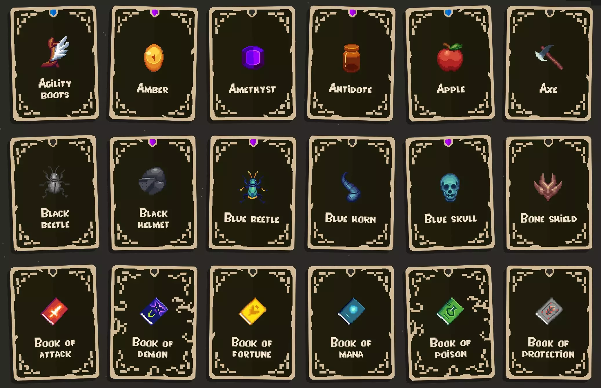 C级:紫水晶、斧头、黑甲虫、幸运之书、魔力之书、防护之书、青铜盾、青铜票券、灯泡、奶酪、煤矿、契约、绯红之花、祖母绿、邪恶盾牌、火焰盾牌、金条、黄金斗篷、黄金匕首、绿甲虫、头带、治疗法杖、免疫石、墨水瓶、猕猴桃、柠檬、魔法棒、蜂蜜酒、坚果、挂锁、辣椒、剧毒匕首、剧毒战锤、防护植物、死者之戒、卷轴、潜行项链、时间盾牌、番茄