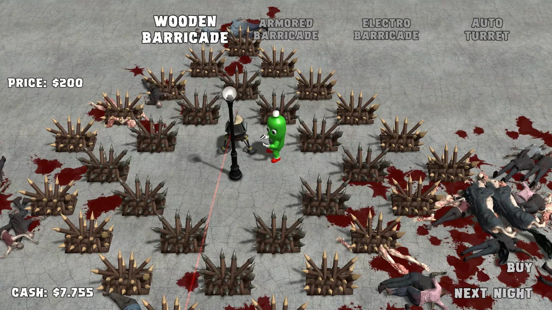 轻松获取困难成就:Precise cut 1. 创建防御模式游戏,最好单人进行。坚持到第7-8晚,此时将生命值升级到200。不建造障碍物的话,可以购买链锯和手榴弹。 2. 购买冷冻枪,到第9晚就能攒够购买激光枪的钱,最后买下激光枪。